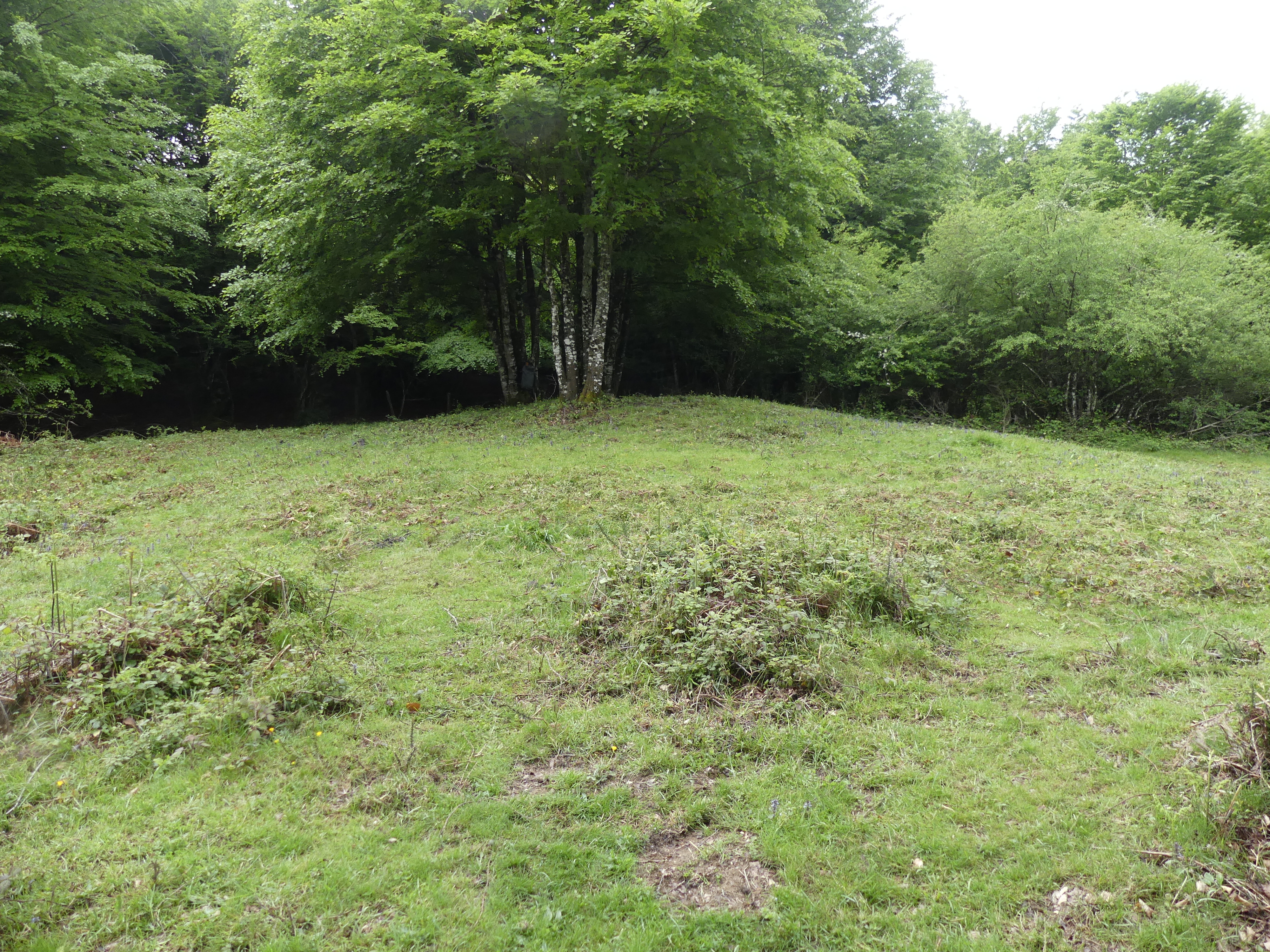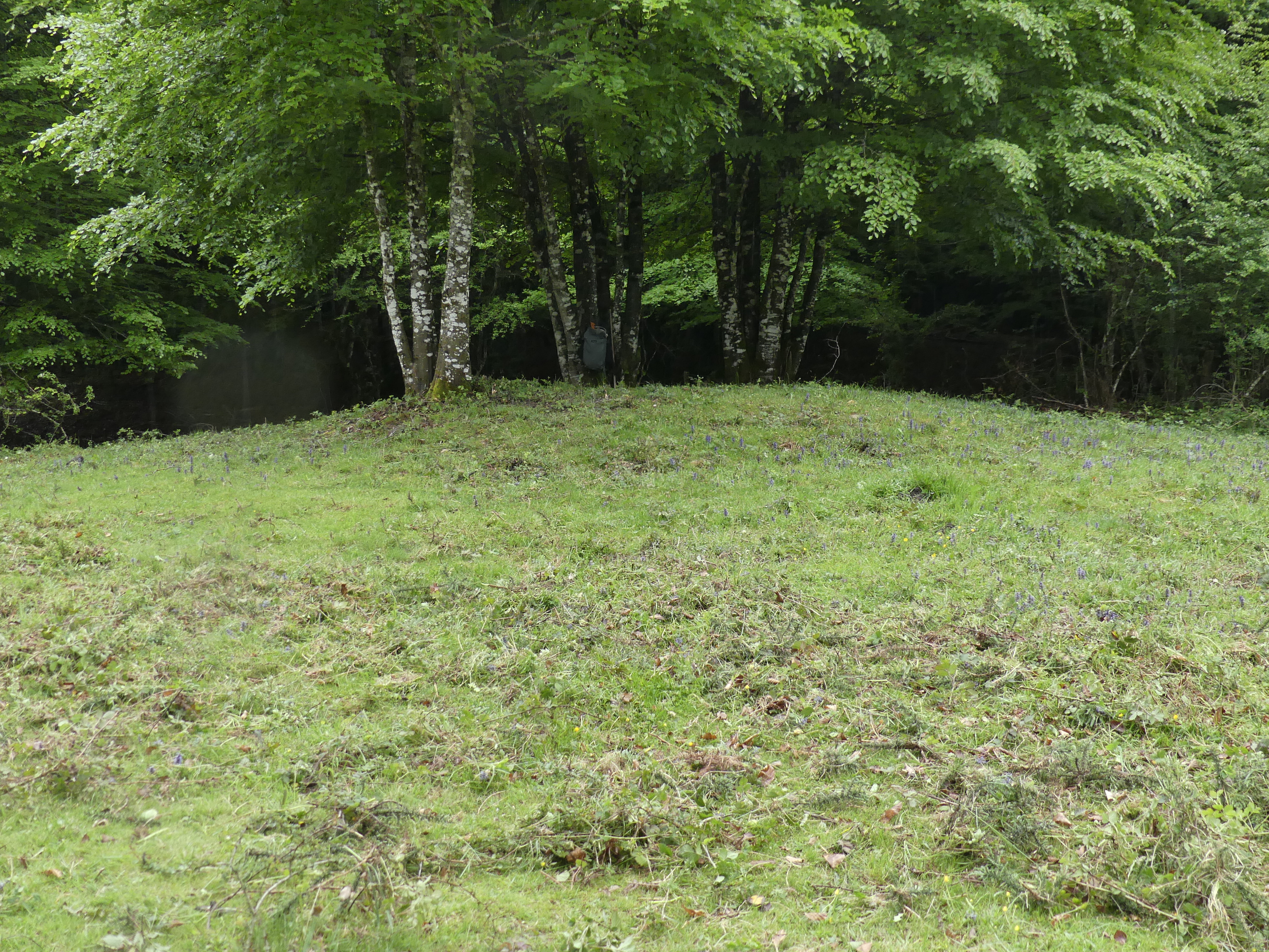 TÚMULO DE ALDUDEKO BIDEA, AURIZBERRI-ESPINAL LOCALIZACIÓN Coordenadas UTM, ETRS-89, X: 632.605, Y: 4.761.731, Z: 931 Erro TOPONIMIA Aldudeko Bidea CONTEXTO PAISAJISTICO Situado en la cabecera occidental del pequeño valle de Oiarzabal, dentro del término del concejo de Aurizberri-Espinal? y muy cerca de la pista forestal de acceso, se localiza este túmulo, donde su gran consolidación lo ha mantenido muy disimulado entre helechos y espinos a pesar de encontrarse junto a un viejo camino pecuario y en el lindero de un bosque de hayas y pastizales tradicionales. HISTORIOGRAFÍA Inédito DESCRIPCIÓN Se trata de un gran túmulo muy consolidado, cubierto de plantas de haya, espinos y helechos que enmascaran su incidencia visual, tan solo detectable tras la limpieza de la vegetación. La formación de suelo encima de su estructura también ha contribuido a disimular su existencia, aunque en la actualidad se aprecian cantos rodados entre la hierba, de tamaño mediano, habituales en las estructuras de los monumentos de la zona. Al parecer tuvo cráter de profanación, en la actualidad muy colmatado. TIPOLOGÍA Túmulo Cronología: Edad del Bronce Diámetro: 9-10 m Altura: 0,70-80 m USO DEL SUELO Polígono: 9; Parcela rústica: 152; subparcela: A Grupo: Forestal no arbolado; Cobertura principal: Otros pastos arbolados; Recinto: 9464 INTERPRETACIÓN Y VALORACIÓN A pesar de pasar desapercibido, el propio lugar en esta ruta pecuaria, nos parece una elección lógica. Existen otras manifestaciones megalíticas con la misma situación en el mismo camino, al norte y al sur de este punto, y en el entorno cercano, detectamos en los años 80, sílex tallado calcolítico y un gran molino en arenisca triásica, depositado en el almacén del patrimonio arqueológico del Gobierno de Navarra. Los monumentos catalogados más cercanos son, el menhir de Oianondo al sureste y en el mismo camino, dolmen de Urdantzarreta al noroeste y los dólmenes de Artzilo al nordeste. CONSERVACIÓN Aparentemente buena, confirmada tras una limpieza superficial que nos confirma la estructura tumular y el cráter de profanación, puede también estar expoliado de parte de su estructura pétrea al encontrarse junto a un viejo camino, hoy fosilizado. Mantiene en el propio túmulo varias plantas de haya que no le hacen ningún favor. CIRCUNSTANCIAS DEL HALLAZGO Hallazgo casual de Juan Mari Martínez Txoperena, el 31 de octubre del 2023