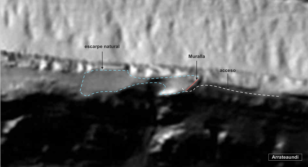 LOCALIZACIÓN Término municipal de Arakil Coordenadas ETRS-89, X: 588.398, Y: 4.754.159, Z: 796 TOPONIMIA Arrateaundi CONTEXTO PAISAJISTICO Asentamiento de altura en fuerte farallón calizo, orientado de Este a Oeste separado y paralelo a la sierra de Aralar, elevado unos 340 m sobre el valle y desde el que se domina todo el corredor del Arakil. Las vertientes Norte y sur la forman sendos escarpes muy difÃciles de escalar, el Oeste culmina en la cumbre de Madalen Haitz, hagiónimo que tiene que ver con los restos de una antigua ermita cercana bajo la advocación de La Magdalena. HISTORIOGRAFÃA Aparece en la obra de T. López Selles contribución a un catálogo de ermitas de Navarra, pág. 470 (14) como ermita de La Magdalena. DESCRIPCIÓN Al escoger el lugar para este asentamiento, buscaron sobre todo la seguridad y solo necesitaron un lienzo de 45 m de muralla el resto lo daban las condiciones naturales del enclave. Se cerraba el único paso al área habitada, con un muro orientado de Suroeste a Nordeste, de sillarejo en seco con calizas del lugar. El acceso lo realizarÃan desde el espolón Sureste al borde del acantilado que mira al valle. TIPOLOGÃA Núcleo de población Superficie fortificada: 15.000 m2 PerÃmetro fortificado: 750 m Eje máximo: 300 m Eje mÃnimo: 55 m CronologÃa: Hierro I-II Emplazamiento: Farallón rocoso USO DEL SUELO PolÃgono: 14; Parcela rústica: 274 (sub-parcela G) Grupo: Forestal no arbolado; Cobertura principal: Afloramientos rocosos y roquedo; Recinto 12936 Grupo: Frondosas; Cobertura principal: Hayas (Fagus sylvatica); Recinto 12790 INTERPRETACIÓN Y VALORACIÓN Como interpretación del significado de este poblado, podemos decir que es un ejemplo claro de refugio de altura, utilizando un enclave donde apenas necesitaba un trabajo moderado en la fortificación. Asà el espacio protegido que lograban era importante, aunque los condicionantes, de falta de agua y fuerte desnivel de 340 m, con relación a la base del valle, le dotaban de una incomodidad extrema, pero a la vez les facilitaba una gran seguridad con extenso dominio visual, incluso un cercano espacio económico seguro. Tampoco es casual el hallazgo de varias localizaciones en las cercanÃas, ante la hipótesis de la utilización de este tipo de castros como refugios de urgencia. Como tantos lugares habitados en la protohistoria lo encontramos cristianizado. MATERIALES 20 fragmentos de cerámica manufacturada, cocida en horno reductor, 4 fragmentos a torno, cocidos en horno oxidante, 19 pellas de barro, un fragmento de cerámica vidriada marrón de aspecto moderno, 2 lascas de sÃlex, 2 clavos de herradura y un fragmento de arenisca pulimentada. CONSERVACIÓN No apreciamos ningún afección que haya podido alterar su posible estratigrafÃa o estructuras, solo la vegetación y el tiempo transcurrido, lo que nos garantiza una buena conservación del yacimiento. CIRCUNSTANCIAS DEL HALLAZGO Prospección pedestre de Andoni Peña Lakunza, miembro de Ezpilleta Elkartea, en el contexto del poblamiento protohistórico vascón a la llegada de los romanos, el 17 de diciembre del 2013 BIBLIOGRAFÃA LÓPEZ SELLES T. 1975, Contribución a un catálogo de ermitas de Navarra, Cuadernos de EtnologÃa y etnografÃa de Navarra (CUET), 470 Los datos de esta ficha han sido facilitados por su descubridor