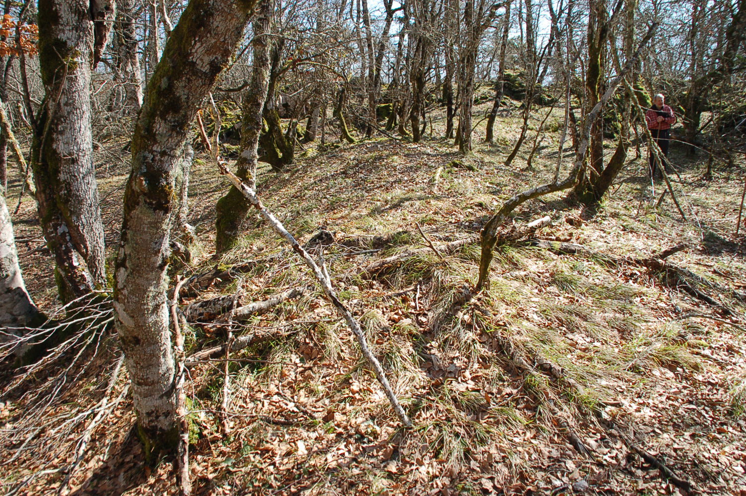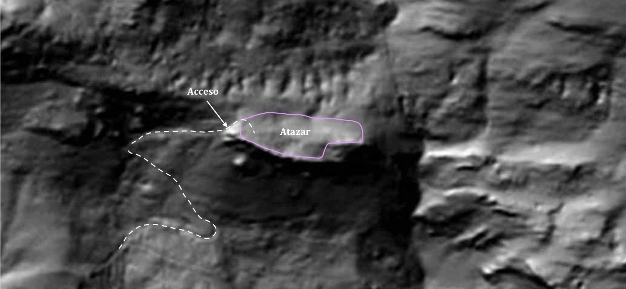 LOCALIZACIÓN Arruazu Coordenadas ETRS-89, X: 580.999, Y: 4. 754.933, Z: 819 TOPONIMIA Atazar, Auntzsare CONTEXTO PAISAJISTICO En la solanera de la sierra de Aralar localizado en un rellano cubierto de hayas y al borde de un acantilado o fuerte pendiente que domina el valle a modo de balcón. El paraje goza de una gran espectacularidad y dominio visual del valle, aunque el terreno cárstico y accidentado reúne una gran incomodidad y no obstante observamos evidencias de antropización en abrigos habilitados como refugio de personas o animales HISTORIOGRAFÃA Inédito DESCRIPCIÓN Se trata de un gran rellano de más de 2 hectáreas en la fuerte ladera meridional de la sierra de Aralar creando un espacio ovalado con afloramientos calizos de tipo cárstico. Dentro de este espacio, se levantaron cierres con muros en diferentes épocas que, por el estado actual de la vegetación, no es fácil de interpretar, la disponibilidad del agua no la tenÃan lejana y con pequeños cierres puntuales conseguirÃan un espacio habitable. TIPOLOGÃA Pequeño núcleo de población Superficie fortificada: No se aprecia PerÃmetro fortificado: No se aprecia Eje máximo: 275 m Eje mÃnimo: 85 m CronologÃa: Hierro Emplazamiento: Terraza en altura USO DEL SUELO PolÃgono: 1; Parcela rústica152 (Sub-parcela C) Grupo: Frondosas; Cobertura principal: Haya (Fagus sylvatica); Recinto: 12449 INTERPRETACIÓN Y VALORACIÓN No tenemos datos para forjar una interpretación argumentada, solo la referencia al Este, de un antiguo cierre de piedra derrumbado y vegetado, al que no podemos asignar una cronologÃa argumentada pues no compone una figura coherente. En realidad se trata de un gran balcón colgado en la solanera de la sierra de Aralar que no necesitaba fortificación, si acaso, pequeños cierres parciales orientados hacia la subida del valle, hasta este lugar, llega un viejo camino de ascenso de la localidad de Arruazu denominado Portuzar (puerto viejo) y el propio topónimo Atazar (puerta vieja) hace referencia al mismo, otra particularidad tiene el acceso por el Norte, con nula protección natural. En este paraje accidentado y tortuoso, se conserva al Oeste otro muro de cierre, que nos parece moderno y cerraba el acceso por este lado, muy cerca de este cierre se hallo la cerámica. MATERIALES Se reducen a dos fragmentos cerámicos y una mano de molino extraÃdo a notable profundidad en una cata estratigráfica practicada en los restos del muro al este del rellano. CONSERVACIÓN No apreciamos afecciones antrópicas y creemos que las practicas forestales tampoco han dañado el paraje por tanto tiene que ser buena. CIRCUNSTANCIAS DEL HALLAZGO Prospección pedestre de Ernesto Flores, miembro de Ezpilleta Elkartea en fecha indeterminada. BIBLIOGRAFÃA