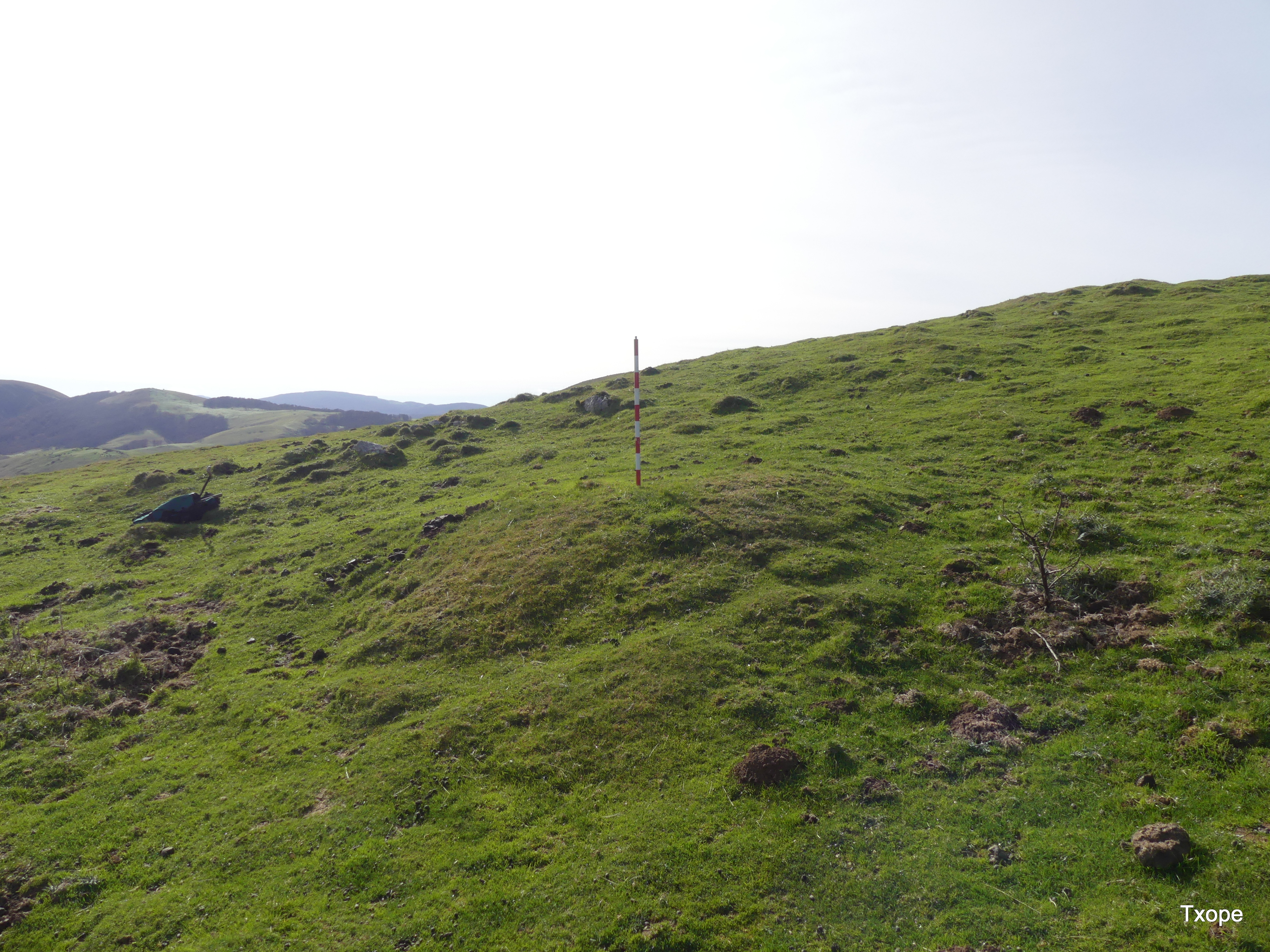 BEARDEGIKOGAÑA T-3, ERROIBAR LOCALIZACIÓN Coordenadas UTM, ETRS-89, X: 629.991, Y: 4,765.321, Z: 1121 Erroibar-Valle? de Erro TOPONIMIA Beardegikogaña CONTEXTO PAISAJISTICO Pastizales de Montaña DESCRIPCIÓN Pequeño túmulo funerario en terreno despajado y suave ladera, perfectamente definido, aunque no se aprecia peristalito. TIPOLOGÍA Diámetro: 4 m Altura: 0,80 m Cronología: Edad del Hierro Emplazamiento: Ladera USO DEL SUELO PolÃgono: 23, Parcela rústica: 25, Subparcela: Y. Grupo: Forestal no arbolado, Cobertura principal: Pastizal de Alta montaña, recinto: 7774 INTERPRETACIÓN Y VALORACIÓN Túmulo funerario cercano a otros dos, un menhir y un crómlech, localizado en la ladera Este de Sorolepo donde se localizan otro menhir y un dolmen así como varios fondos de cabaña. En 1948, José Miguel de Barandiaran, catalogó en esta ladera un túmulo, un crómlech y un dolmen en Beardegi. MATERIALES No disponemos de ningún material CONSERVACIÓN Se halla perfectamente conservado y sin muestras aparentes de saqueo o profanación CIRCUNSTANCIAS DEL HALLAZGO Prospección pedestre de Juan Mari Martínez Txoperena, el 24 de septiembre del 2020 BIBLIOGRAFÍA http://wiki.txoperena.es/tiki-index.php?page=Beardegikogaina+C