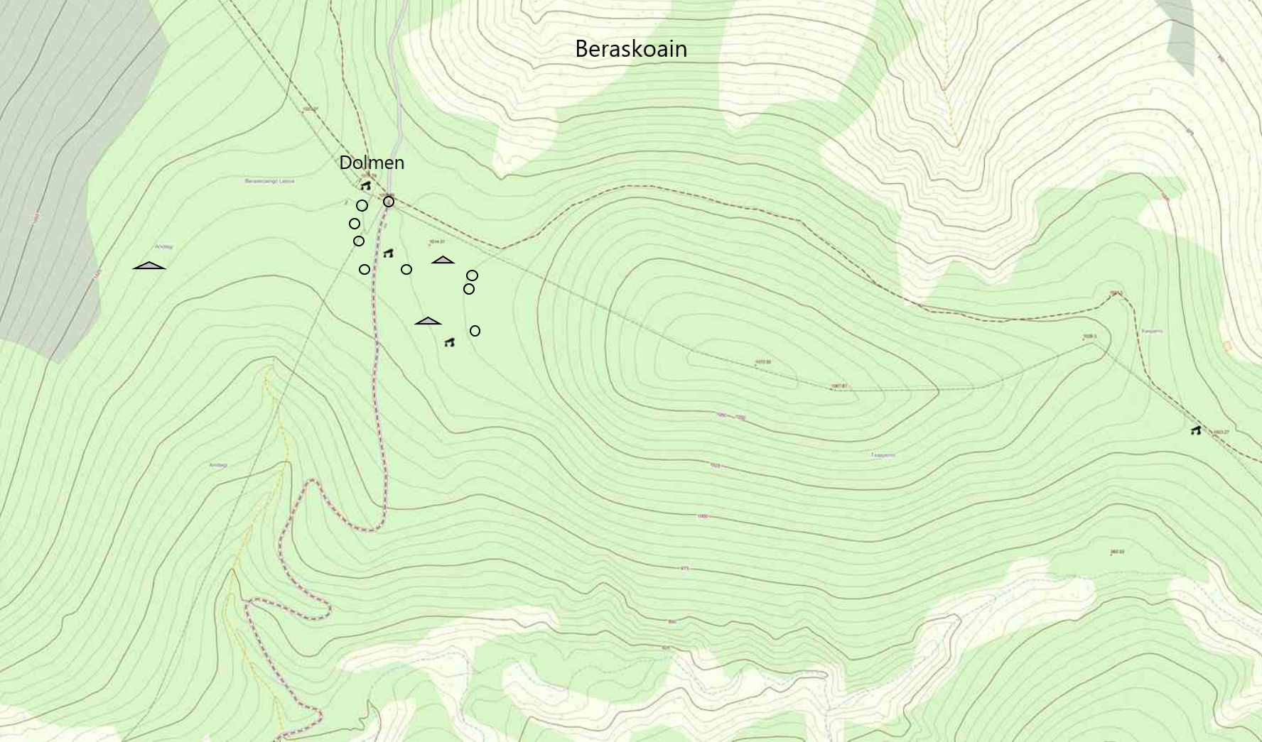 Crómlech que se localiza en el oriente de la estación, pocos metros al este de Beraskoain T 5, en un plano ligeramente más elevado, desde él se puede ver todo el conjunto. Tiene el peristalito más pequeño de todo el conjunto, con 3,50 m. de diámetro y se encuentra bastante definido. La fotografía está tomada desde el sureste. Al fondo, a la izquierda, se pueden ver restos de chozas. fueron denunciados en 1983 por P. ARRESE, L. MILLÁN y F. ONDARRA. Coordenadas UTM. ED-50, X: 630.755, Y: 4.764.617, Z: 1015 Coordenadas UTM, ETRS-89, X: 630.652, Y: 4.764.408, Z: 1015 Diámetro: 3,50 m y podemos ver 13 testigos Datos tomados el día: 24-9-05 a las 11,14 horas MTN. 1: 25.000. H. 91-III (51-12) Olaberri Término Municipal de: Erroibar Localizado por: P. Arrese, L. Millán y F. Ondarra, el 13-8-1983 Zona 27, Sorogain-Ibañeta