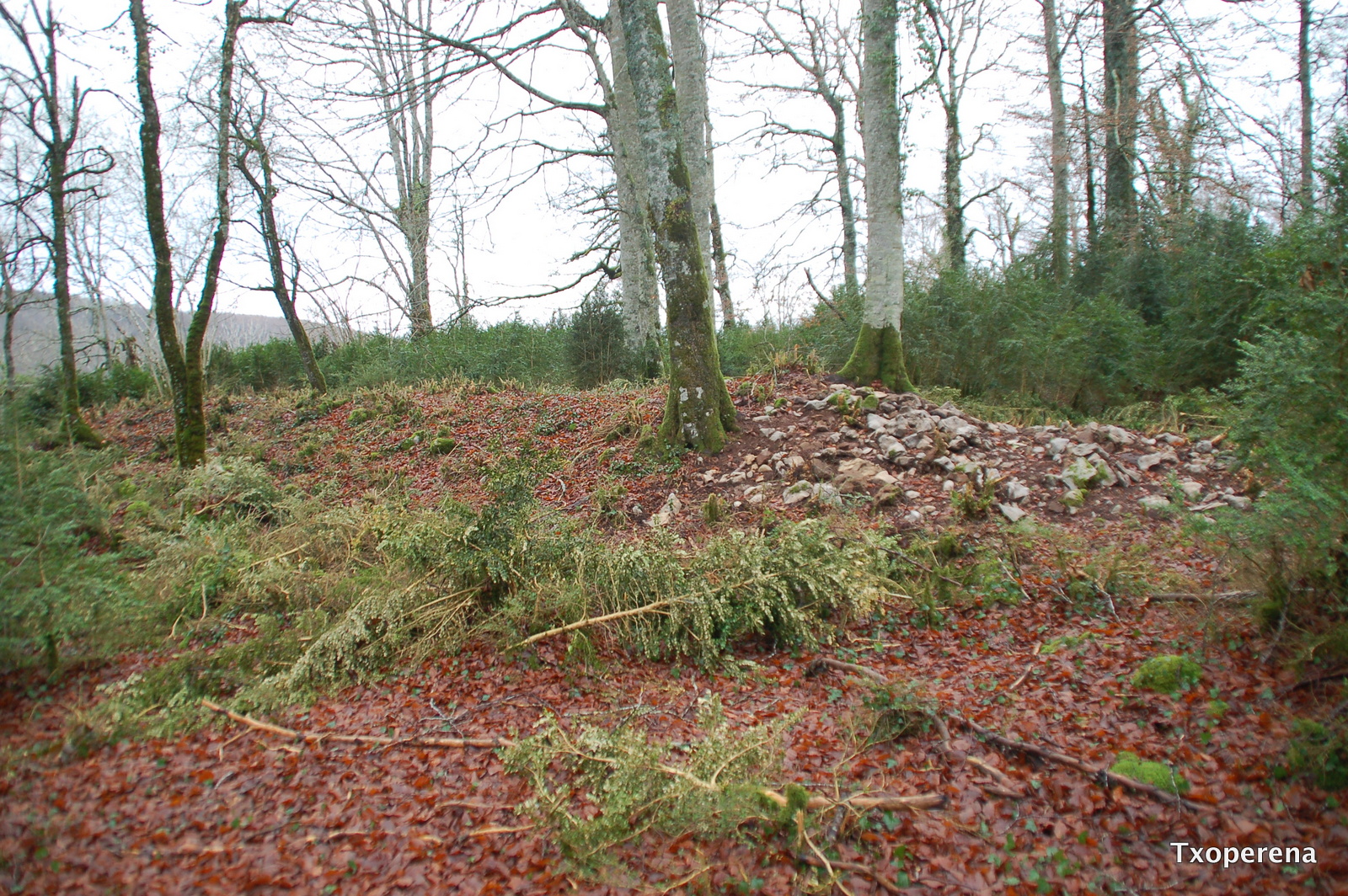 Coordenadas: ETRS-89, X: 634.594, Y: 4.758.595, Z: 965 TipologÃa: Lugar de habitación, núcleo de población Superficie fortificada: 5.700 m2 PerÃmetro fortificado: 310 m Eje máximo: 100 m Eje mÃnimo: 70 CronologÃa: Hierro Emplazamiento: cerro Término municipal: Auritz-Burguete? PolÃgono: 1, parcela rústica 65 (sub-parcela A) Grupo: Frondosas, cobertura principal Hayas (Fagus sylvatica), recinto10283Entorno: Bosque de hayas con sotobosque de boj en sustrato calizo, situado al sur de la llanada de Otegi por encima de la confluencia de Aetzubiko Ugaldea y Xuringoa Ugaldea. Conservación: Los problemas propios del clima y el tiempo transcurrido, son los únicos que en principio podemos esperar, no vemos alteraciones antrópicas importantes ni por caminos ni otras causas que las propias de las explotaciones forestales, por tanto suponemos que existirá estratigrafÃa conservada. Materiales: No disponemos de ningún material Circunstancias del hallazgo: Prospección de Juan Mari MartÃnez Txoperena, en el contexto del poblamiento protohistórico pirenaico a la llegada de los romanos. Localizado: El 16 de octubre del 2015 Valoración del yacimiento: Creemos que tiene mucha importancia como testigo del control del territorio, sobre todo en referencia a la llanada de Otegi donde llegaban varias rutas prehistóricas que atravesando el Pirineo confluÃan en este llano para tomar distintas direcciones por las diferentes sierras hacia el Sur y donde después llegarian las calzadas romanas que procedentes de Asturica y Caesaraugusta, para desde aquà juntas llegar a Burdigalam. Con esta localización, Mezkirizperro e Irumeaka (los tres conectados visualmente)se completaba el control del paso, por el Sur, Oeste y Este. El asentamiento aprovecha un fuerte escarpe rocoso natural por el Sureste que apenas necesitaba atención y completaba el cerco con un terraplén probablemente amurallado, un foso natural (en parte) reforzado o agrandado y un pequeño tramo de muralla al Este, por donde se realizarÃa el acceso.