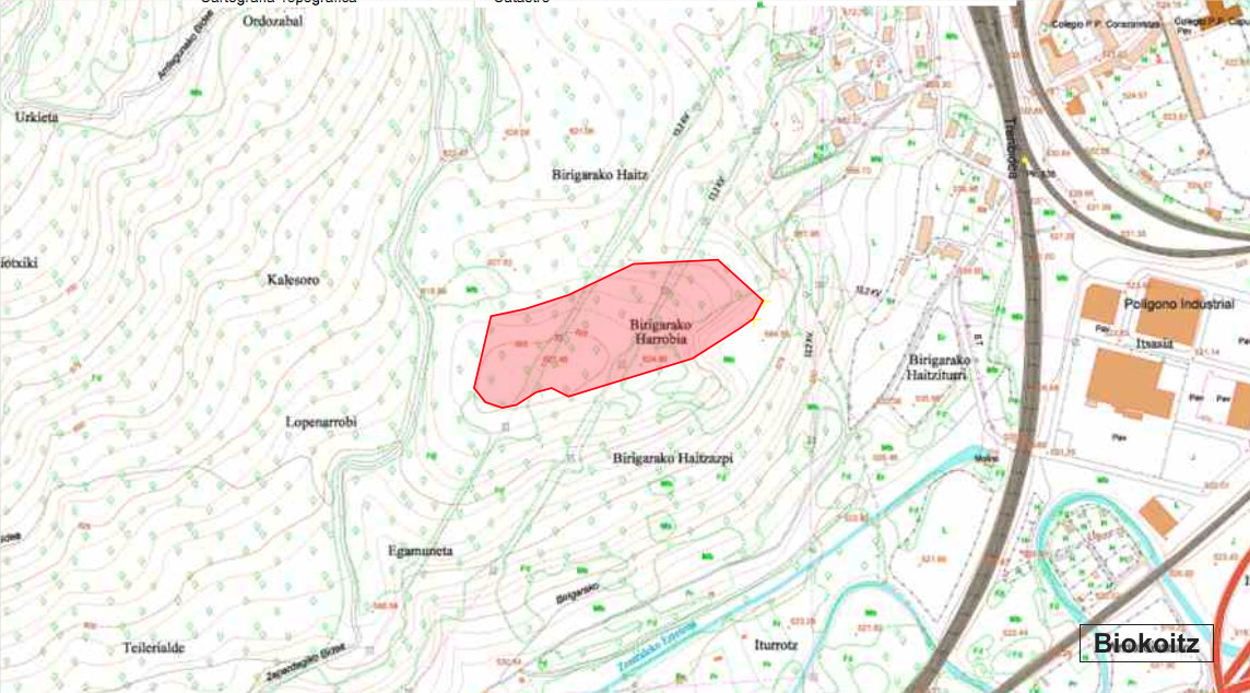 LOCALIZACIÓN Término municipal de Olazti-Olazagutia? Coordenadas ETRS-89, X: 566.396, Y: 4.748.878, Z: 627 TOPONIMIA Birigarako Aitz CONTEXTO PAISAJISTICO Estribación oriental de la sierra de Alzania, situado en afloramiento calizo donde hubo una cantera de áridos hoy clausurada. Tanto al Sur como al Este discurren la autovÃa NA-1 y el ferrocarril Madrid-Irun? en un entorno de alta industrialización de los entornos urbanos de Olazti y Alsasua. HISTORIOGRAFÃA Inédito como poblado DESCRIPCIÓN Aprovechando los grandes escarpes naturales, de un afloramiento calizo al pie de la sierra de Alzania, consiguieron un espacio suficientemente protegido como para instalar un poblado. El enclave actualmente presenta evidencias claras de la muralla que protegió el perÃmetro por el Sur, Norte y Sureste. Vemos indicios de lo que pudieron ser fosos en el lado occidental, también apreciamos indicios de bancales y plataformas antrópicas sin utilidad agrÃcola en la ladera oriental. El lugar estratégicamente escogido, goza de una perfecta visión del pasillo que forman las sierras de Urbasa, Alzania y Aralar, Andia TIPOLOGÃA Núcleo de población Superficie fortificada: 35.200 m2 PerÃmetro fortificado: 825 m Eje máximo: 335 m Eje mÃnimo: 130 m CronologÃa: Hierro Emplazamiento: Terraza colgada sobre valle USO DEL SUELO PolÃgono: 4; Parcela rústica: 10 (sub-parcelas A,C) Grupo: Frondosas; Cobertura principal: Roble pedunculado (Quercus robur); Recinto 16106 Grupo: Forestal no arbolado, Cobertura principal: Suelo desnudo; Recinto 16690 INTERPRETACIÓN Y VALORACIÓN Es posible que ya en la Edad del Bronce se asentaran en este lugar, pero no podemos asegurar cuando se abandona, aunque siempre después del s III a. C. La relevancia estratégica del emplazamiento a caballo entre el valle y la sierra, si es interesante, además su amplia superficie puede estar indicando un asentamiento con población importante. Otro dato a tener en cuenta es la existencia dentro del recinto de varios túmulos que pudieran ser evidencias de estructuras de habitación, también vemos evidencias de minerÃa, aunque nos parecen posteriores. El descubrimiento de varias estelas de la Edad del hierro, en Biokoitzazpi, 300 m al Sureste, pudieran estar señalando la necrópolis de este poblado. MATERIALES En el recinto fortificado y las inmediaciones se han recuperado restos lÃticos de 13 molinos giratorios a la que habrÃa que sumar las estelas depositadas en el almacén de la sección de Bienes Muebles y arqueologÃa de Navarra. CONSERVACIÓN El aspecto actual es bueno, se aprecia muy consolidado aunque con alteraciones por pistas y una cantera de áridos con actividad en el s. XX, hoy clausurada, pero que afecto gravemente a toda la zona Sureste. CIRCUNSTANCIAS DEL HALLAZGO El descubrimiento de este castro fue posible por el trabajo de Pedro Arrese, Felix Lazkoz y Mikel Markotegi, pertenecientes a Ezpilleta Elkartea que se han preocupado de la prospección y estudio de los materiales recuperados. BIBLIOGRAFÃA Datos facilitados por Mikel Marcotegi miembro de Ezpilleta Elkartea