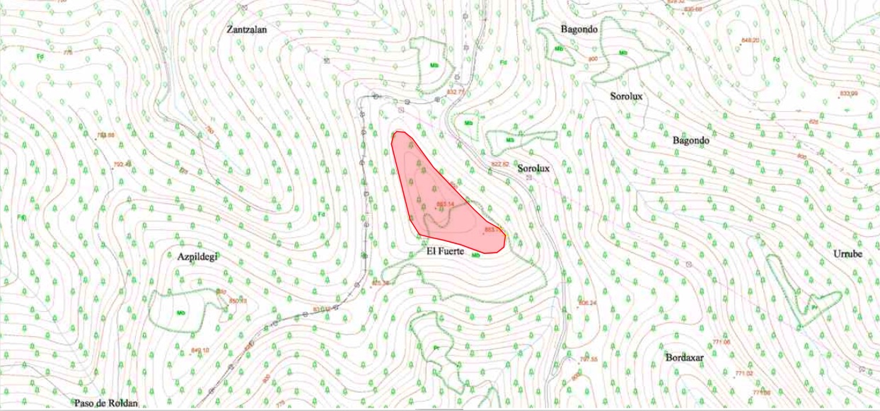 LOCALIZACIÓN Coordenadas UTM. ED-50: X: 626.180, Y: 4.757.179, Z: 863 Coordenadas UTM, 30-N, ETRS-89, X: 626.180, Y: 4.757.179, Z: 863 TOPONIMIA El Fuerte. El topónimo “El Fuerte†nos parece moderno (quizás de la época de la construcción del fuerte, S. XVIII-XIX) pero muy cerca por el sur existe un topónimo que nos sugiere que el antiguo se encuentre corrido como es el de Maurigain (Murugain¿?). CONTEXTO PAISAJISTICO Terreno mixto de praderas, bosque de pino silvestre y espeso sotobosque de boj y matorral, es refugio habitual para: Ciervo, JabalÃ, Corzo, Tejón, Zorro Marta, Fuina, Gineta, Comadreja y en el entorno vemos habitualmente Ratonero común, Milano, Alimoche, Buitre, Paloma torcaz, Azor, CernÃcalo, Pito negro, Pito real, Pito picapinos, Cuervo, Corneja, Chova, Arrendajo, mirlo y una larga lista de aves menores. Cruzado por el Camino de Santiago, actualmente frecuentado por miles de viandantes que circulan debajo del castro. HISTORIOGRAFÃA Inédito DESCRIPCIÓN Cerro amesetado donde concurren las habituales y elementales formas de fortificación, que han llegado hasta nuestros dÃas como potentes terraplenes. Estos pueden o no, disimular en su interior restos de murallas de piedra, en este caso no apreciamos este detalle, pero tampoco es de extrañar, en un lugar donde se construyo un reducto militar durante las guerras Carlistas, del que se aprecia su planta y formas arquitectónicas muy integradas en el terreno. TIPOLOGÃA Núcleo de población Superficie fortificada: 12.080 m2 PerÃmetro fortificado: 512 m Eje máximo: 213 m Eje mÃnimo: 58 m CronologÃa: Hierro Emplazamiento: Cerro USO DEL SUELO PolÃgono: 4; Parcela rústica:1002, 1003; Subparcelas: A, A y B Grupo: Forestal no arbolado; Cobertura principal: Pastizal; Recinto 11261 INTERPRETACIÓN Y VALORACIÓN Se trata de un emplazamiento en cerro, donde apreciamos la realización de fuertes terraplenes defensivos clásicos en este tipo de asentamientos. Según la tradición en la zona, se utilizo como emplazamiento artillero en las guerras Carlistas por los dos bandos y efectivamente sobre el terreno observamos los restos de un fortÃn con incipientes baluartes de pequeño tamaño con su correspondiente foso-trinchera. Se trata de un cerro situado encima de una antigua vÃa pecuaria, hoy conocida como Camino de Santiago que lo bordea por la parte Norte y Oeste. La situación en conexión visual con el Castro de Measkoitz y otros de la comarca y su situación al pie de tan importante vÃa, sugiere su función estratégica en el sistema de vigilancia y control de las comunicaciones en la época del hierro. El acceso se efectuaba por el Suroeste y aparentemente solo tendrÃa una sola lÃnea defensiva completa con posibilidad de una segunda defensa adelantada al Sur en forma también de terraplén, el recinto aprovechaba el fuerte escarpe natural del cerro que lo dotaba de una preventiva, efectiva y natural defensa. No tenemos evidencias materiales de industria de ningún tipo a pesar de haberlas buscado, pero teniendo en cuenta su uso agrÃcola-ganadero y su utilización como reducto en las guerras Carlistas, no debe de extrañarnos por la reutilización de la piedra a la que habrÃa sido sometida en la construcción del fortÃn y a su tradicional uso como pastizal, de todas formas, dentro del recinto fortificado, vemos un túmulo con la posibilidad de que sea funerario. MATERIALES No disponemos de ningún material CONSERVACIÓN El estado en que se encuentra aparentemente es bueno pero además de utilizarse agrÃcolamente mantiene una afección importante por la construcción de un fuerte artillero en las guerras Carlistas, por lo que consideramos que se pudo remover su posible estratigrafÃa. CIRCUNSTANCIAS DEL HALLAZGO Prospección de Juan Mari MartÃnez Txoperena, el 3 de abril del 2006 BIBLIOGRAFÃA