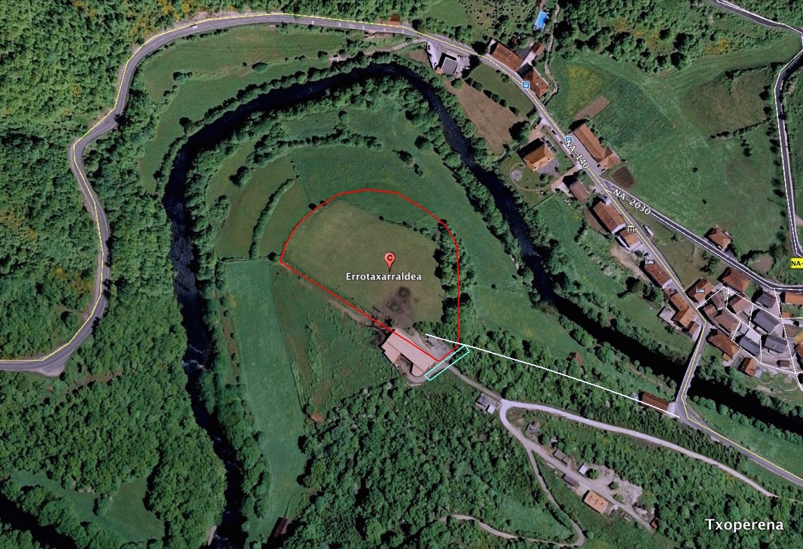 • Coordenadas: ETRS-89, X:641.454, Y: 4.755.988, Z: 724 • TipologÃa: Lugar de habitación, núcleo de población • Superficie fortificada: 12.200 m2 • PerÃmetro fortificado: 455 m • Eje máximo: 160 m • Eje mÃnimo: 90 m • CronologÃa: Hierro • Emplazamiento: Valle • Término municipal: Aribe • PolÃgono: 1, Parcelas rústicas: 84 (sub-parcela C), 135 (sub-parcelas E,F), 139 (sub-parcelas A,B), 140, 141 • Grupo: Herbáceas de secano, cobertura principal: Praderas, recinto 11798 • Grupo: Frondosas, cobertura principal: Otras mesclas de frondosas, recinto 11871 • Entorno: Paisaje mixto de bosque, prados, rÃo, núcleo urbano y vÃas de comunicación, terreno quebrado pero humanizado en buen estado ecológico y abundante fauna como el Ciervo, Corzo, JabalÃ, Zorro, Tejón, Marta, Fuina y anidan el Ratonero común, Milano Real, Gavilán, Azor, Pito negro, Pito real, Pito picapinos, Cuervo, Corneja, Chova, Arrendajo y una amplia nómina de aves menores. • Conservación: Alterado por labores agrÃcolas tradicionales de uso secular y la instalación de una estructura ganadera que en parte han desfigurado el castro aunque puede todavÃa identificarse el foso y el acceso antiguo. • Materiales: No disponemos de ningún material • Circunstancias del hallazgo: Prospección de Juan Mari MartÃnez Txoperena y Rafa Zubiria Mujika, en el contexto del poblamiento protohistórico pirenaico a la llegada de los romanos. Localizado: El 25 de octubre del 2012 • Valoración del yacimiento: Solo tenemos para valorar este punto la convicción de la utilización del meandro del rÃo Irati con este menester, nos apoyamos en la orto-foto histórica y la de relieve del SITNA, para mantener esta ubicación como castro del hierro, además de los restos de la poliorcética original, la experiencia nos indica que no desaprovechaban estas condiciones, junto al rÃo como fuente de recursos, demostrada ya en el neolÃtico en el cercano refugio de Aitzpea (Ana Cava, 1988 ), aunque la dificultad de encontrar evidencias es grande por su utilización secular para la agricultura y actualmente con una nave ganadera en su interior, nos afirmamos en atribuir al enclave este carácter, conserva indicios del foso y la rampa de acceso se encuentra bien definida y es factible que la rampa sea contemporánea.