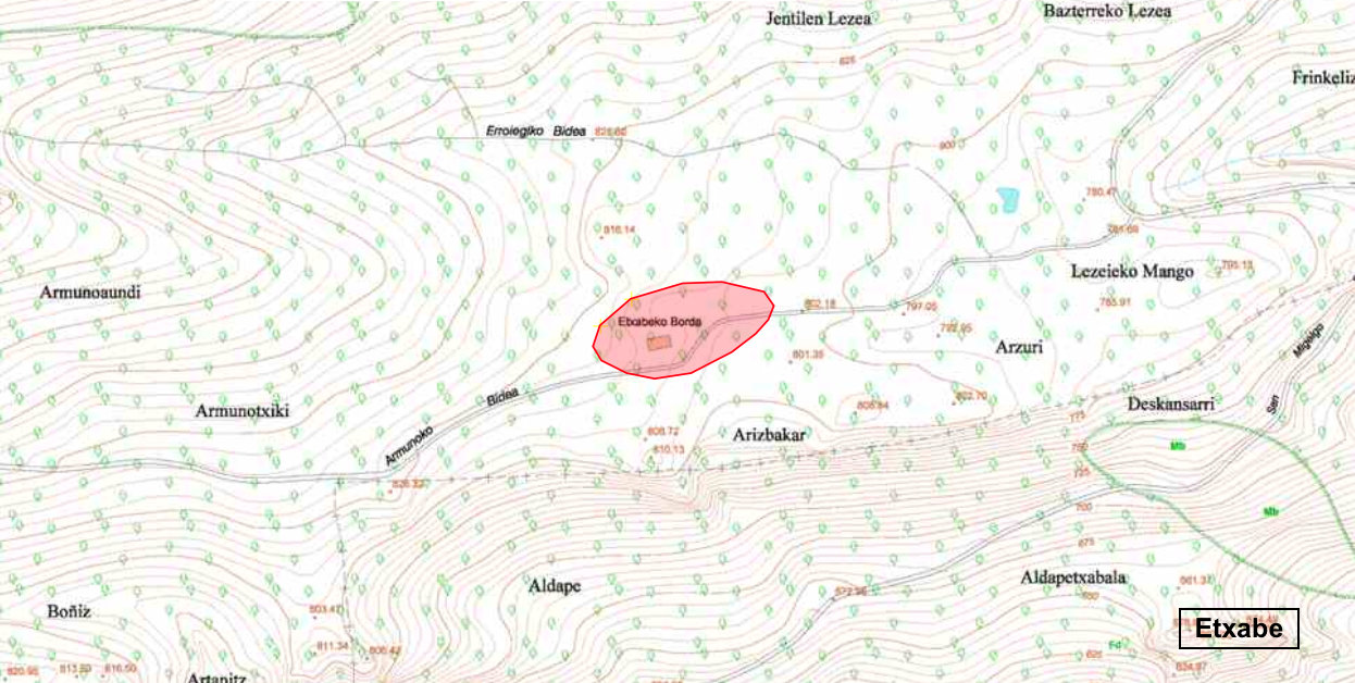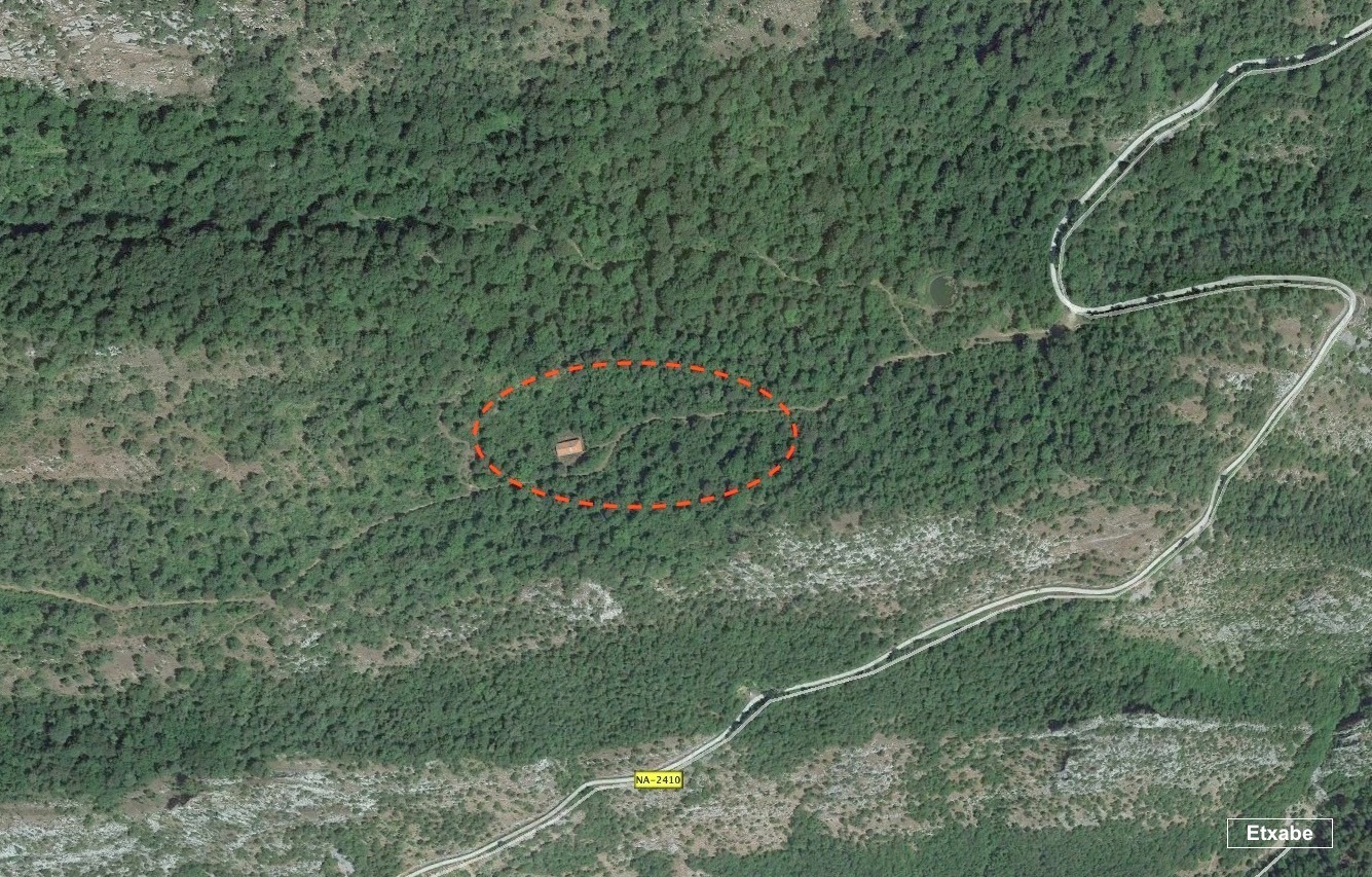 LOCALIZACIÓN Término municipal de Huarte Arakil Coordenadas ETRS-89, X: 585.819, Y: 4.754.926, Z: 800 TOPONIMIA Etxabe CONTEXTO PAISAJISTICO A media altura entre el valle del Arakil y la sierra de Aralar, en un viejo camino que recorre un tramo de ladera con fuerte vegetación de matorral y robles. En este lugar existen importantes ruinas del viejo desolado de Etxabe y como referencia esta la borda del mismo nombre y el bonito dolmen de Aranzadi de Etxabe. Excavado en agosto de 1913 por Telesforo de Aranzadi y Florencio Ansoleaga y publicado en: Exploración de cinco dólmenes del Aralar, Pamplona 1915, por los mismos autores. HISTORIOGRAFÃA En este lugar sitúan el desolado medieval de Etxabe, poblamiento que habrÃa perdurado desde la Edad del Bronce, http://wiki.txoperena.es/tiki-index.php?page_ref_id=626&bl=n&saved_msg=y DESCRIPCIÓN En la pista que asciende de Uharte Arakil al santuario de San Miguel de Aralar, coger en la bifurcación el ramal que conduce a la borda de Etxabe. En este camino se ha realizado la recogida fragmentos de cerámica prehistórica. La cerámica aparece a lo largo de una distancia de más de 400 m y presenta mayor concentración a medio camino, entre la iglesia y los restos de las casas del citado despoblado. Se trata de un lugar de espesa vegetación, por lo que los resultados satisfactorios de la prospección, se reducen a las escasas zonas donde la erosión se hace notar (principalmente el mismo camino). Se encuentra a cota de 800 m y presenta un fuerte escarpe al sur. Cabe destacar también la conexión visual que existe desde la ruina de la iglesia con respecto a los yacimientos de Madalen-Arrateaundi? e Ilarraga. TIPOLOGÃA Núcleo de población Superficie: 41.000 m2 PerÃmetro: 975 m Eje máximo: 300 m Eje mÃnimo: 185 m CronologÃa: Bronce-Hierro? Emplazamiento: Ladera USO DEL SUELO PolÃgono: 2; Parcelas rústicas: 357, 358 (sub-parcelas AC y R) PolÃgono: 1; Parcela rústica 1 (sub-parcela C) Grupo: Frondosas; Cobertura principal: Otras mezclas de frondosas; Recinto12384 Grupo: Frondosas; Cobertura principal: Roble pubescente (Quercus pubescens); Recinto 12550 INTERPRETACIÓN Y VALORACIÓN MATERIALES - 32 fragmentos de cerámica manufacturada - 1 fragmento de arenisca pulimentada CONSERVACIÓN El poblamiento histórico puede haber afectado a los restos protohistóricos pero creemos que no fue de manera grave, por tanto, sin poder hacer una evaluación precisa por la cubierta vegetal que impide una mÃnima visión de conjunto, creemos que reúne buenas condiciones de conservación. CIRCUNSTANCIAS DEL HALLAZGO Prospección pedestre de Andoni Peña Lakuntza, miembro de Ezpilleta Elkartea, en el contexto del poblamiento protohistórico vascón a la llegada de los romanos, el 20 de enero del 2014 BIBLIOGRAFÃA Los datos han sido facilitados por su descubridor Las personas que necesiten las coordenadas, se facilitaran en < >