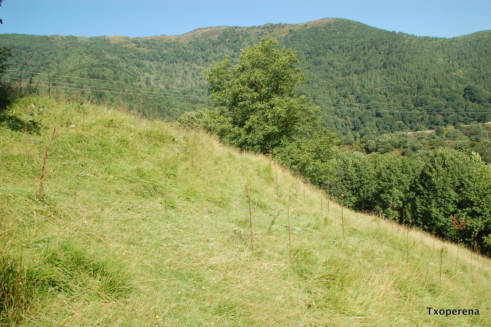 • Coordenadas: ETRS-89, X: 608.194, Y: 4.783.533, Z: 145 • TipologÃa: Lugar de habitación, núcleo de población • Superficie fortificada: 10.500 m2 • PerÃmetro fortificado: 420 m • Eje máximo: 105 m • Eje mÃnimo: 93 m • CronologÃa: Hierro • Emplazamiento: Valle • Término municipal: Sunbilla • PolÃgono: 2, parcela rústica: 105 (sub-parcelas A, C, D, G, H, I, K, M, P, S, T, U, X) • Grupo: Herbáceas de secano, cobertura principal: praderas, recinto 2913 • Grupo: Frondosas, cobertura principal: Otras mezclas de frondosas, recinto 2908 • Grupo: Improductivo, cobertura principal: red viaria, recinto 2834 • Grupo: Frondosas, cobertura principal: roble pedunculado (Quercus robur), recinto 2953 • Entorno: Promontorio de fuertes laderas, en acusado meandro del rÃo Bidasoa, con el istmo ocupado con las carreteras actuales, donde se cruza Meorberuko erreka con un profundo foso natural y desemboca en el rÃo girando al Norte, La mayor parte de sus laderas están ocupadas por espesa vegetación de robles, castaños y matorral atlántico. • Conservación: Es difÃcil evaluar el estado de conservación, aunque el uso tradicional ha sido de praderas y no tiene por que estar muy afectado por estas labores, de cualquier forma lo vemos alterado por deslizamientos, debido a las fuertes laderas y la gran pluviosidad de la zona. • Materiales: Carecemos de materiales • Circunstancias del hallazgo: Prospección de Juan Mari MartÃnez Txoperena y Rafa Zubiria Mujika, en el contexto del poblamiento protohistórico pirenaico de la calzada romana, localizado el 4 de agosto del 2015. • Valoración del yacimiento: Si este asentamiento se confirmara, seria un ejemplo de aprovechamiento de las condiciones orográficas con fines defensivos, donde el rio Bidasoa y otro curso de agua, le proporcionaban una importante primera protección y las pendientes naturales otra segunda, por tanto con un cerco superior elemental sin gran alarde, resultarÃa suficiente para su protección, esto se aprecia en el lugar a pesar de su antropización, la situación estratégica en el pasillo del rÃo, le aporta recursos y un valor añadido por el control del mismo. El topónimo ha sido un indicio importante para su localización.