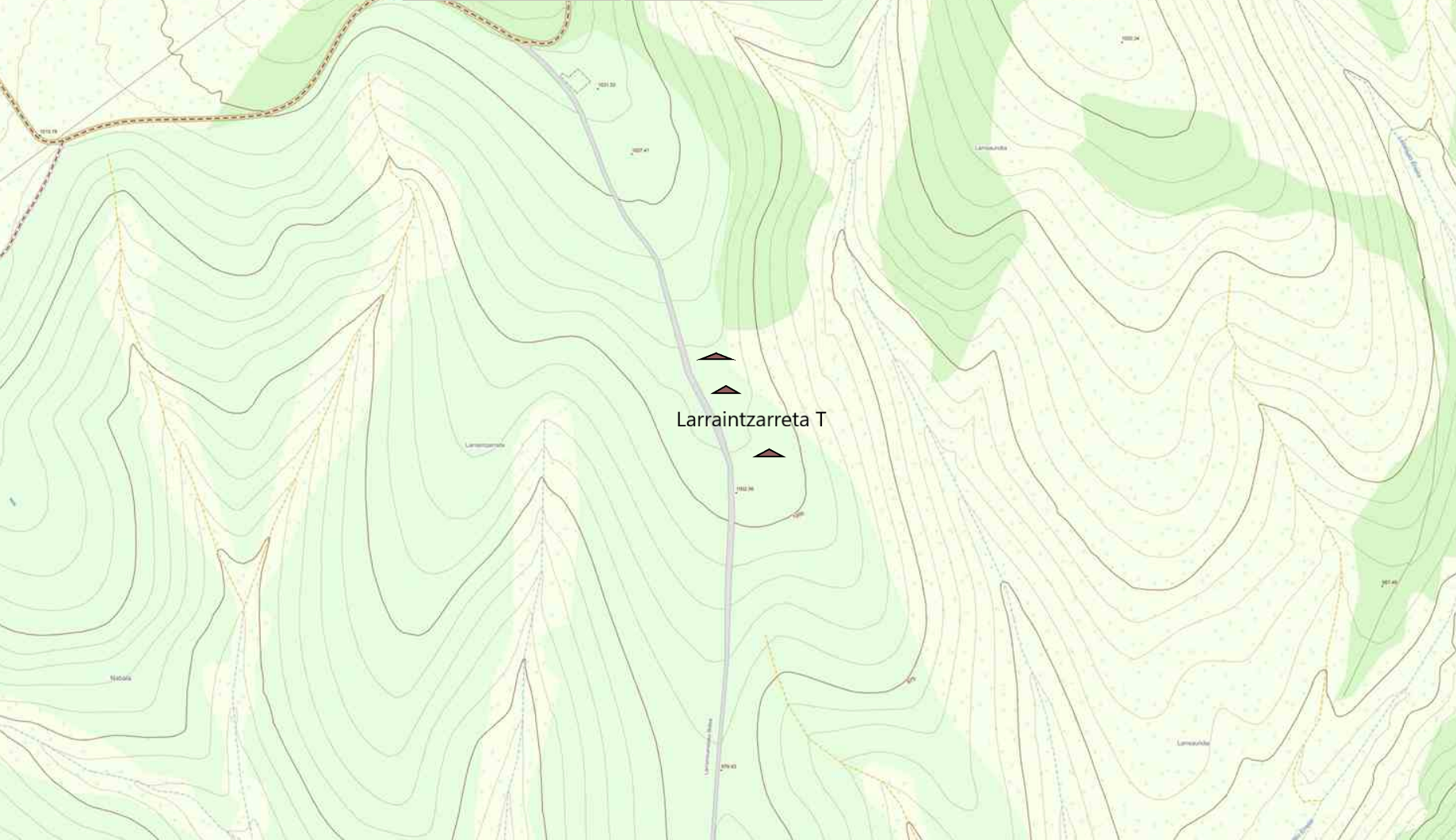 Estructura tumular que, al encontrarse dentro de una pradera artificial que periódicamente se labra, corre riesgo de dañarse seriamente. Pertenece a un conjunto de dos túmulos y cinco aterrazamientos, lo que nos conduce a pensar que se trata de un verdadero asentamiento. Lo localizamos el año 1987 y los creíamos desaparecidos por las obras de mejora de pastizales realizadas posteriormente, llevándonos una grata sorpresa al reencontrarlos intactos recientemente. El que nos ocupa es el más meridional de los dos y se encuentra mas dañado por labores agrícolas. El otro es Larraintzarreta I.? Posiblemente el topónimo haga referencia a los aterrazamientos al modo de eras. Coordenadas UTM. ED-50, X: 639.518, Y: 4.762.274, Z: 996 coordenadas UTM, ETRS-89, X: 639.415, Y: 4.762.065, Z: 996 Datos tomados el día 27-5-06 a las17,58 horas Diámetro: 16 m. y 1,00 m. de altura MTN. 1:25000. H.116-II (52-13) Garralda Término Municipal de Orbaitzeta Localizado por: Juan Mari Martínez Txoperena, el 27-5-2006 Zona 29, Urkulu-Irati