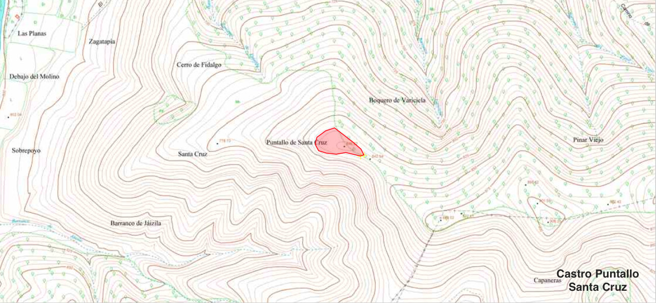 LOCALIZACIÓN Término municipal de Nabaskoze-Navascues? Coordenadas ETRS-89, X: 656.095, Y: 4.734.482, Z:846 TOPONIMIA Puntallo Santa Cruz CONTEXTO PAISAJISTICO Se localiza en loma y se protege con doble foso por el cordal Este, en un ambiente de vegetación rala donde abundan las hierbas aromática como tomillo, romero y arbustos como ollagas y boj. HISTORIOGRAFÃA Inédito DESCRIPCIÓN Pequeño recinto de planta ovoide irregular, fortificado con la aplicación de una poliorcética elemental, a base de terraplenes coronados con muralla pétrea y dos fosos paralelos por la zona Este de mas fácil acceso. TIPOLOGÃA Núcleo de población Superficie fortificada: 2.300 m2 PerÃmetro fortificado: 199 m Eje máximo: 62 m Eje mÃnimo: 40 m CronologÃa: Hierro Emplazamiento: Loma USO DEL SUELO PolÃgono: 6; Parcela rústica: 144; Subparcela: B, G Grupo: Forestal no arbolado; Cobertura principal: Bojeral; Recinto 69296 Grupo: ConÃferas; Cobertura principal: Pino silvestre (pinus sylvestris); Recinto 25625 INTERPRETACIÓN Y VALORACIÓN Positiva, como ya hemos avanzado, dentro del recinto fortificado podemos observar restos de la muralla y otros sin determinar, con algunos espacios sin arbustos que denotan la posibilidad de estructuras enterradas. La poliorcética muy sencilla y elemental, sin embargo potente, no resta importancia al emplazamiento castreño, sin duda bien dotado para su defensa, con magnÃfico control del valle y el rÃo del que mantiene un desnivel de 243 m y 900 m de distancia. El acceso bien pudo ser del Sureste con circulación perimetral en el sentido de las agujas del reloj para alcanzar el interior del recinto por el Norte junto al foso, aunque este aspecto no lo tengamos muy determinado. En cuanto a la cronologÃa y perduración, tampoco podemos avanzar la hipótesis de un periodo determinado por carecer de elementos y evidencias suficientes. Los poblados conocidos mas cercanos serÃan: Paco de la Guardia, 2.100 m (Nabaskoze-Navascues); Sengues-Navascues?, 3.650 m (nabaskoze-Navascues); El Poyo, 4.450 m (Nabaskoze-Navascues); Peñarroya, 5.700 m (Nabaskoze-Navascues); Entrepeñas, 6.900m (Nabaskoze-Navascues); Likarri 7.150 m (Nabaskoze-Navascués); Bordablanca 8.100 m (Nabaskoze-Navascués, Urraul Goiti-Urraul? Alto) y Santa Ãgata 8.500 m (Izal-Güesa). MATERIALES No se ha recogido por la espesa vegetación que recubre todo el recinto fortificado. CONSERVACIÓN Se aprecia el aparente buen estado de conservación al no haberse sometido a ningún tipo de afección, ni agrÃcola y tampoco forestal que haya necesitado de pistas ni repoblaciones y consideramos improbable el reciclaje, al menos, importante de la piedra de sus murallas que se aprecia derruida por toda la zona Oeste y Norte, con apreciable terraplén al Sur donde se ven evidencias de muros de piedra, al Este como hemos dicho se le doto de doble foso, de donde se habrÃa extraÃdo piedra para las fortificaciones, cerrando de esta manera la poliorcética del castro. CIRCUNSTANCIAS DEL HALLAZGO Prospección de Juan Mari MartÃnez Txoperena, en el contexto del poblamiento protohistórico del entorno de la calzada romana, el 6 de junio del 2015 BIBLIOGRAFÃA