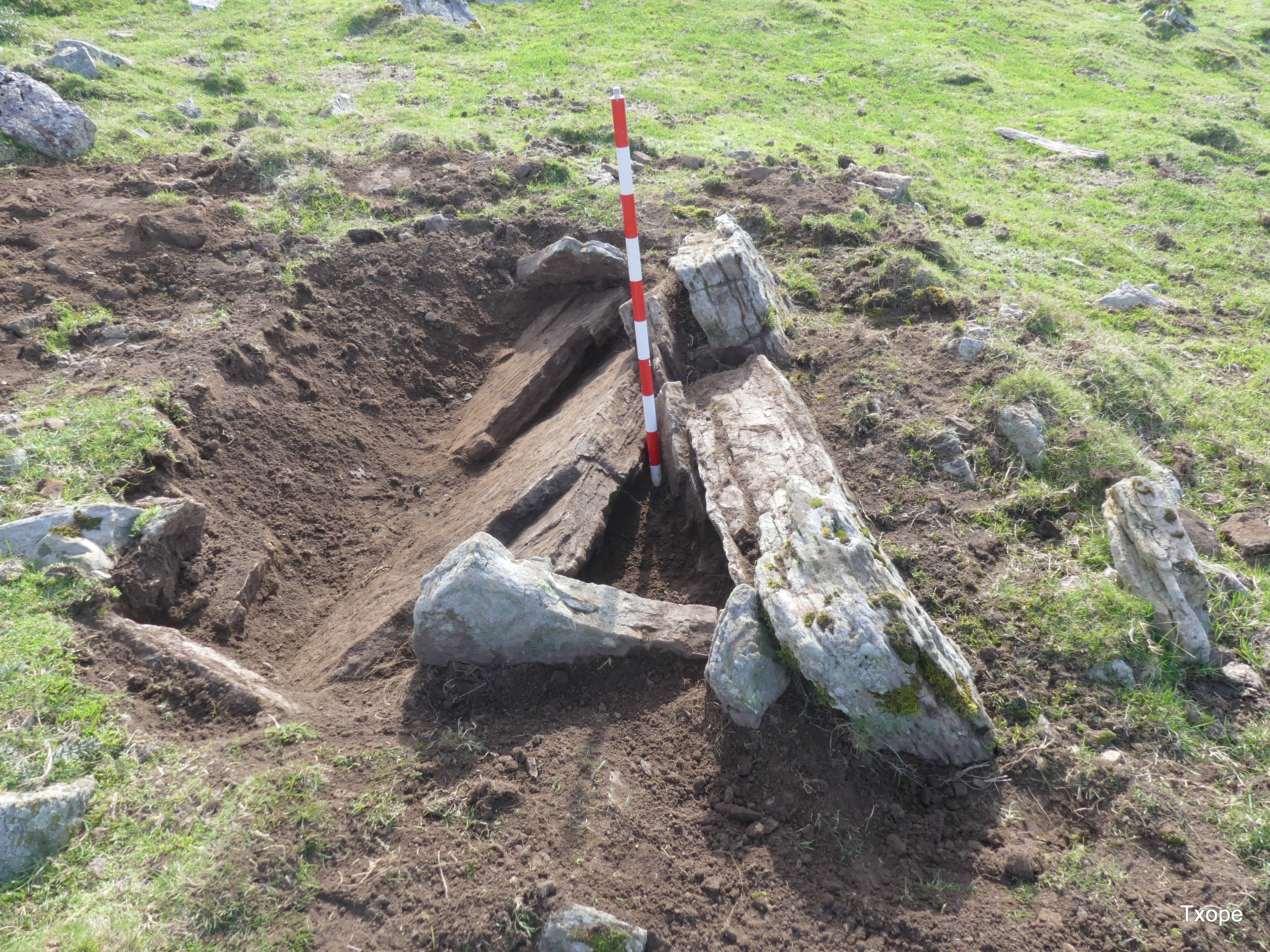 LOCALIZACIÖN Coordenadas UTM, ETRS-89, X:629.807, Y: 4.765.352, Z: 1143 Sorogain, Erroibar-Valle? de Erro TOPONIMIA Sorolepo CONTEXTO PAISAJÍSTICO Pastizales de altura DESCRIPCIÓN Dolmen con galgal de 7 m de diámetro y 0,70 m de altura, la cámara de 2 m de largo y 1,20 m de anchura construida con losas de cuarcita del lugar, la orientación igual que la mayoría de los dólmenes de la zona es Sur-Sureste?. Se trata de un dolmen cerrado, con la pared izquierda u occidental compuesta de dos losas reforzada con otra fina al interior, la cabecera con otras dos, la derecha u oriental con una sola losa también reforzada con otra al exterior y la entrada cerrada con una losa de 6 cm. Sobre la cubierta, solo podemos decir sin seguridad que puede estar desplazada al occidente de la cámara fuera del galgal o partida y reciclada en la cerca colindante TIPOLOGÍA Dolmen de montaña cerrado Cronología: Edad del Bronce Emplazamiento: Loma USO DEL SUELO Polígono: 21; Parcela rústica 4; Subparcela: A Grupo: Forestal no arbolado; cobertura principal: Pastizal de montaña; recinto: 8002 INTERPRETACIÓN Y VALORACIÓN Monumento funerario, saqueado y con parte de su galgal reciclado en construcciones pastoriles cercanas, una de ellas es un pequeño cercado tipo corral que afecto en parte a la estructura, Se aprecia que, al vaciar la cámara, la losa lateral oriental cedió al empuje del propio galgal hacia el interior hasta apoyarse en las losas occidentales, que, por su parte ya tenían su propia inclinación también hacia el interior. La valoración es buena pues al menos conserva la estructura completa. MATERIALES No se dispone de ningún material CONSERVACIÓN Aunque alterado, se conserva en estado razonablemente bueno, conserva toda su estructura y la losa colapsada sello la cámara de manera que es posible que haya conservado restos de los enterramientos CIRCUNSTANCIAS DEL HALLAZGO Prospección pedestre de Juan Mari Martínez Txoperena, el 17 de septiembre del 2020