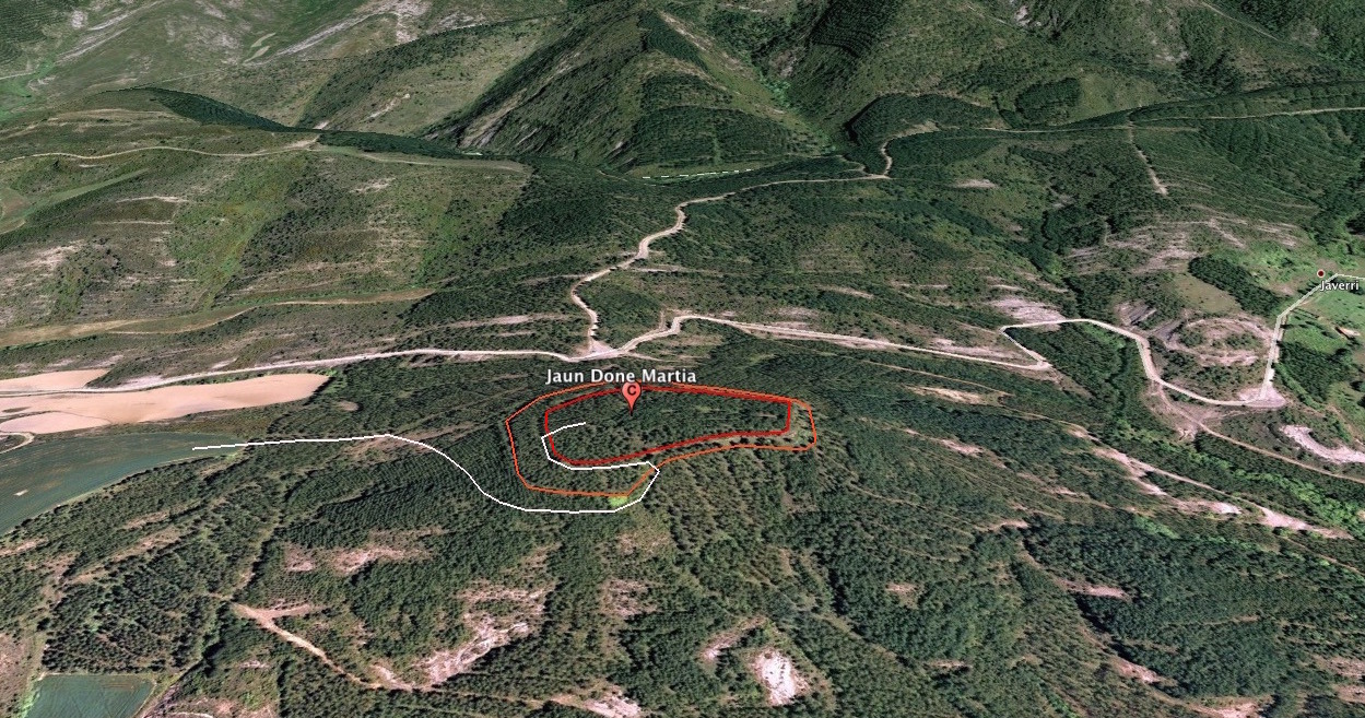• Coordenadas ETRS 89, X: 636.545, Y: 4.736.564, Z: 651 • Clasificación cultural: Hierro • TipologÃa: Núcleo de población • Superficie fortificada: 20.978 m2 • PerÃmetro fortificado: 610 m • Eje máximo: 166 m • Eje mÃnimo: 106 m • Emplazamiento: Cerro • Término municipal: Longida, Concejo de Jaberri (patrimonio forestal de Navarra) • PolÃgono: 6, parcelas rústicas 105,106, sub-parcelas C,D,E • Grupo: ConÃferas, Pino laricio (Pinus nigra), recintos 24049, 24686 • Entorno: Situado en lo alto de un cerro donde se ha utilizado el fuerte escarpe natural oriental para la extracción de piedra y su posterior uso en el refuerzo de los demás taludes, se ven indicios de su antigua utilización agrÃcola y se aprecian los restos de una construcción de apreciables dimensiones, posiblemente una ermita dedicada a San Martin (de ahà su nombre en euskera), actualmente se encuentra repoblado con pino laricio con abundante matorral, principalmente: Enebro (Juniperus communis), Rosal silvestre (Rosa canina), Patxaran (Prunus spinosa) y Ollagas (Genista scorpius) • Conservación: Aparentemente se encuentra bien conservado, pues el uso agrÃcola al que fue sometido en anterior a la aparición del tractor y por tanto afección de los arados solo superficial, los terraplenes se hallan muy bien definidos y la erosión es poco apreciable. • Materiales: En nuestra visita, solo recogimos tres muestras de cerámica pequeña pero representativas, de útil nativo manufacturado, otro de tipo celtibérico a torno y otro de terra sigillata. • Circunstancia del hallazgo: Prospección de Juan Mari MartÃnez Txoperena, en el contexto del estudio de la vÃa romana y su entorno, localizado el 28 de mayo del 2015. • Valoración del yacimiento: Se trata de un poblado fortificado de dimensiones muy apreciables, ocupa un cerro amesetado en dos niveles, el superior serÃa el recinto inicial posteriormente agrandado con un segundo recinto a inferior altura pero igualmente defendido con fuerte terraplén y posible empalizada pues se aprecia todavÃa un parapeto significativo en el borde del terraplén En la loma Sudeste apreciamos también un reforzamiento para dificultar la llegada a la primera defensa y la presencia de abundantes bloques de piedra que de alguna manera obstaculizarÃan el acceso por este cordal. A pesar de la espesa vegetación que no permite ver con facilidad, nuestra hipótesis es, que el acceso se realizaba perimetralmente desde el Oeste, en sentido contrario a las agujas del reloj hasta alcanzar por el sur una zona donde se suaviza la pendiente, para girar otra vez en dirección Oeste y entrar en el recinto inferior. Para la cronologÃa y perduración del mismo, todavÃa no disponemos de elementos suficientes para avanzar una hipótesis sobre su fundación aunque los pocos indicios nos conducen a una perduración larga por el gran esfuerzo realizado para la protección, la ampliación, y el fragmento de sigillata, que si se confirmara llegarÃamos hasta la romanización en el alto imperio o su posterior reutilización tras la crisis del S.III, como existe un caso cercano en Kasteluzar de Ripodas (Armendariz, 2008) | ||