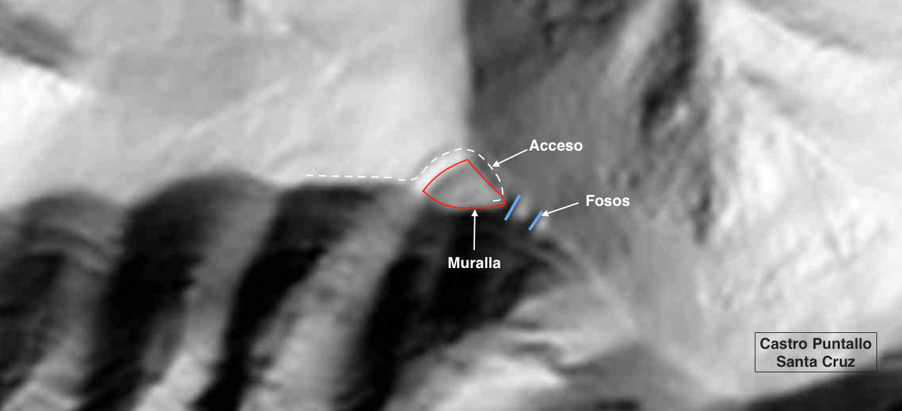 LOCALIZACIÓN Término municipal de Nabaskoze-Navascues? Coordenadas ETRS-89, X: 656.095, Y: 4.734.482, Z:846 TOPONIMIA Puntallo Santa Cruz CONTEXTO PAISAJISTICO Se localiza en loma y se protege con doble foso por el cordal Este, en un ambiente de vegetación rala donde abundan las hierbas aromática como tomillo, romero y arbustos como ollagas y boj. HISTORIOGRAFÃA Inédito DESCRIPCIÓN Pequeño recinto de planta ovoide irregular, fortificado con la aplicación de una poliorcética elemental, a base de terraplenes coronados con muralla pétrea y dos fosos paralelos por la zona Este de mas fácil acceso. TIPOLOGÃA Núcleo de población Superficie fortificada: 2.300 m2 PerÃmetro fortificado: 199 m Eje máximo: 62 m Eje mÃnimo: 40 m CronologÃa: Hierro Emplazamiento: Loma USO DEL SUELO PolÃgono: 6; Parcela rústica: 144; Subparcela: B, G Grupo: Forestal no arbolado; Cobertura principal: Bojeral; Recinto 69296 Grupo: ConÃferas; Cobertura principal: Pino silvestre (pinus sylvestris); Recinto 25625 INTERPRETACIÓN Y VALORACIÓN Positiva, como ya hemos avanzado, dentro del recinto fortificado podemos observar restos de la muralla y otros sin determinar, con algunos espacios sin arbustos que denotan la posibilidad de estructuras enterradas. La poliorcética muy sencilla y elemental, sin embargo potente, no resta importancia al emplazamiento castreño, sin duda bien dotado para su defensa, con magnÃfico control del valle y el rÃo del que mantiene un desnivel de 243 m y 900 m de distancia. El acceso bien pudo ser del Sureste con circulación perimetral en el sentido de las agujas del reloj para alcanzar el interior del recinto por el Norte junto al foso, aunque este aspecto no lo tengamos muy determinado. En cuanto a la cronologÃa y perduración, tampoco podemos avanzar la hipótesis de un periodo determinado por carecer de elementos y evidencias suficientes. Los poblados conocidos mas cercanos serÃan: Paco de la Guardia, 2.100 m (Nabaskoze-Navascues); Sengues-Navascues?, 3.650 m (nabaskoze-Navascues); El Poyo, 4.450 m (Nabaskoze-Navascues); Peñarroya, 5.700 m (Nabaskoze-Navascues); Entrepeñas, 6.900m (Nabaskoze-Navascues); Likarri 7.150 m (Nabaskoze-Navascués); Bordablanca 8.100 m (Nabaskoze-Navascués, Urraul Goiti-Urraul? Alto) y Santa Ãgata 8.500 m (Izal-Güesa). MATERIALES No se ha recogido por la espesa vegetación que recubre todo el recinto fortificado. CONSERVACIÓN Se aprecia el aparente buen estado de conservación al no haberse sometido a ningún tipo de afección, ni agrÃcola y tampoco forestal que haya necesitado de pistas ni repoblaciones y consideramos improbable el reciclaje, al menos, importante de la piedra de sus murallas que se aprecia derruida por toda la zona Oeste y Norte, con apreciable terraplén al Sur donde se ven evidencias de muros de piedra, al Este como hemos dicho se le doto de doble foso, de donde se habrÃa extraÃdo piedra para las fortificaciones, cerrando de esta manera la poliorcética del castro. CIRCUNSTANCIAS DEL HALLAZGO Prospección de Juan Mari MartÃnez Txoperena, en el contexto del poblamiento protohistórico del entorno de la calzada romana, el 6 de junio del 2015 BIBLIOGRAFÃA | ||