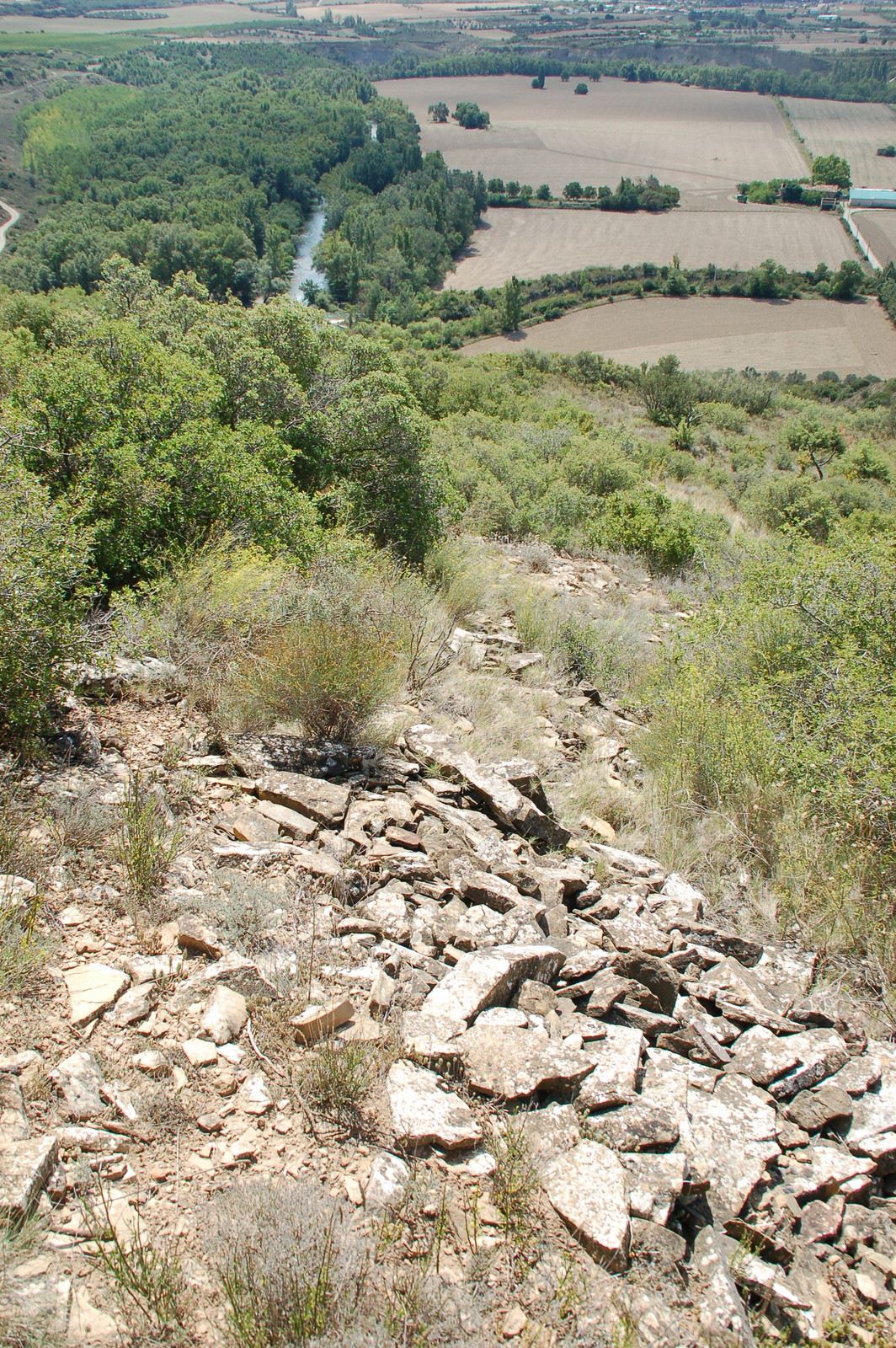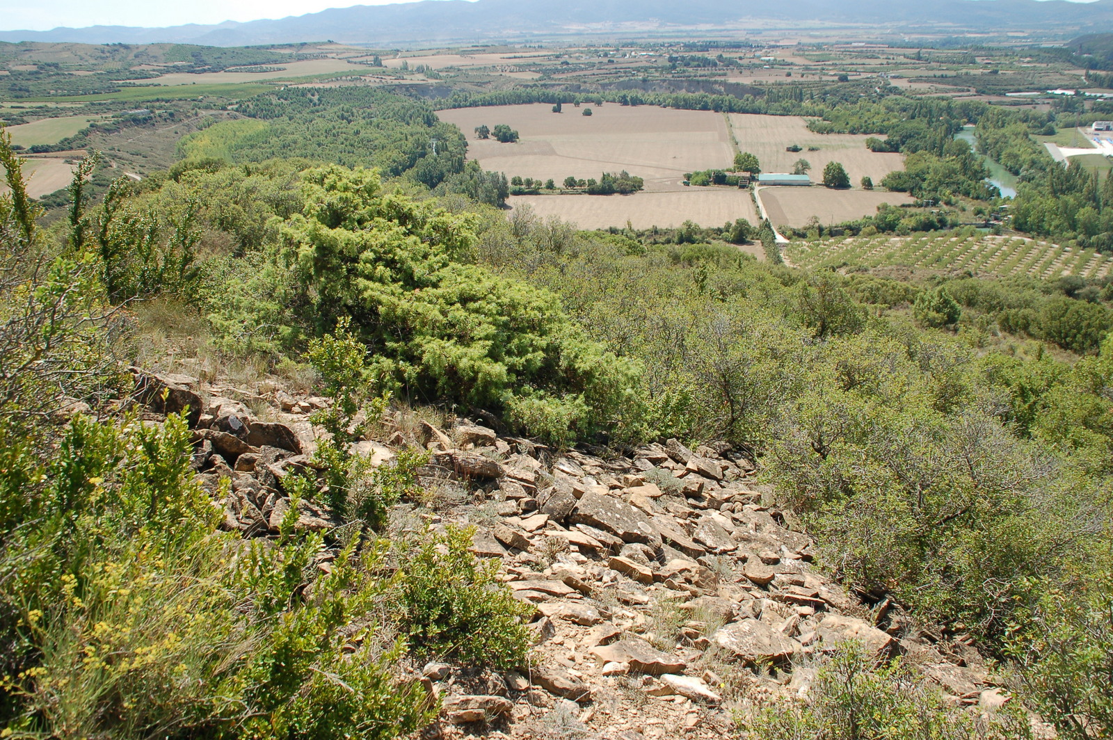 Coordenadas: ETRS-89, X: 642.145, Y: 4.717.755, Z: 500 TipologÃa: Lugar de habitación, núcleo de población Superficie fortificada: 5.250 m2 PerÃmetro fortificado: 315 m Eje máximo: 120 m Eje mÃnimo: 64 m CronologÃa: Hierro Emplazamiento: Valle Término municipal: Liedena PolÃgono: 3, Parcelas rústicas: 304, 311 Grupo: Forestal no arbolado, cobertura principal: Coscojar (Quercus coccifera), recinto 36975 Entorno: Prados viejos con alguna explotación de Almendros, olivos y frutales varios, situado en la confluencia de los rÃos Aragón e Irati, con la vegetación mediterránea clásica de esta zona donde abunda el conejo, la perdiz y sus predadores, zorro, tejón, águila perdicera, otros como el ratonero común, azor, milano, cernÃcalo, aguilucho cenizo, corneja, chova etc. Conservación: Puede encontrarse en buen estado, no se aprecian afecciones graves, en principio no parece haber sido utilizado agrÃcolamente mas que en parte y el recinto principal no lo parece, la muralla derruida se encuentra disimulada bajo la espesa vegetación de coscojas, estando el foso suficientemente identificable. Materiales: No tenemos materiales Circunstancias del hallazgo: Prospección de Juan Mari MartÃnez Txoperena, en el contexto del poblamiento protohistórico pirenaico a la llegada de los romanos. Localizado el 28 de agosto del 2015 Valoración del yacimiento: Ejemplo de emplazamiento para control de territorio y cursos de agua, donde utilizan un escarpe aplomado natural al Este, excavan un pequeño foso al Norte y cierran el resto con muros de piedra en seco, diferenciándose un recinto superior y dos ámbitos mas escalonados. Gran dominio visual al Este, Sur y Oeste con sus fértiles tierras junto a los rÃos y en conexión con varios castros, los mas cercanos: Rocaforte 2.100 (Rocaforte), El Castellón 2150 m (Liedena), Granja de Cortes 3.500 m (Liedena), Puy D’ull 3.600 m (Sangüesa), El Castillar 4.500 m (Javier), San Yuste 6.200 m (Yesa), Lumbier 6.800 m. | ||