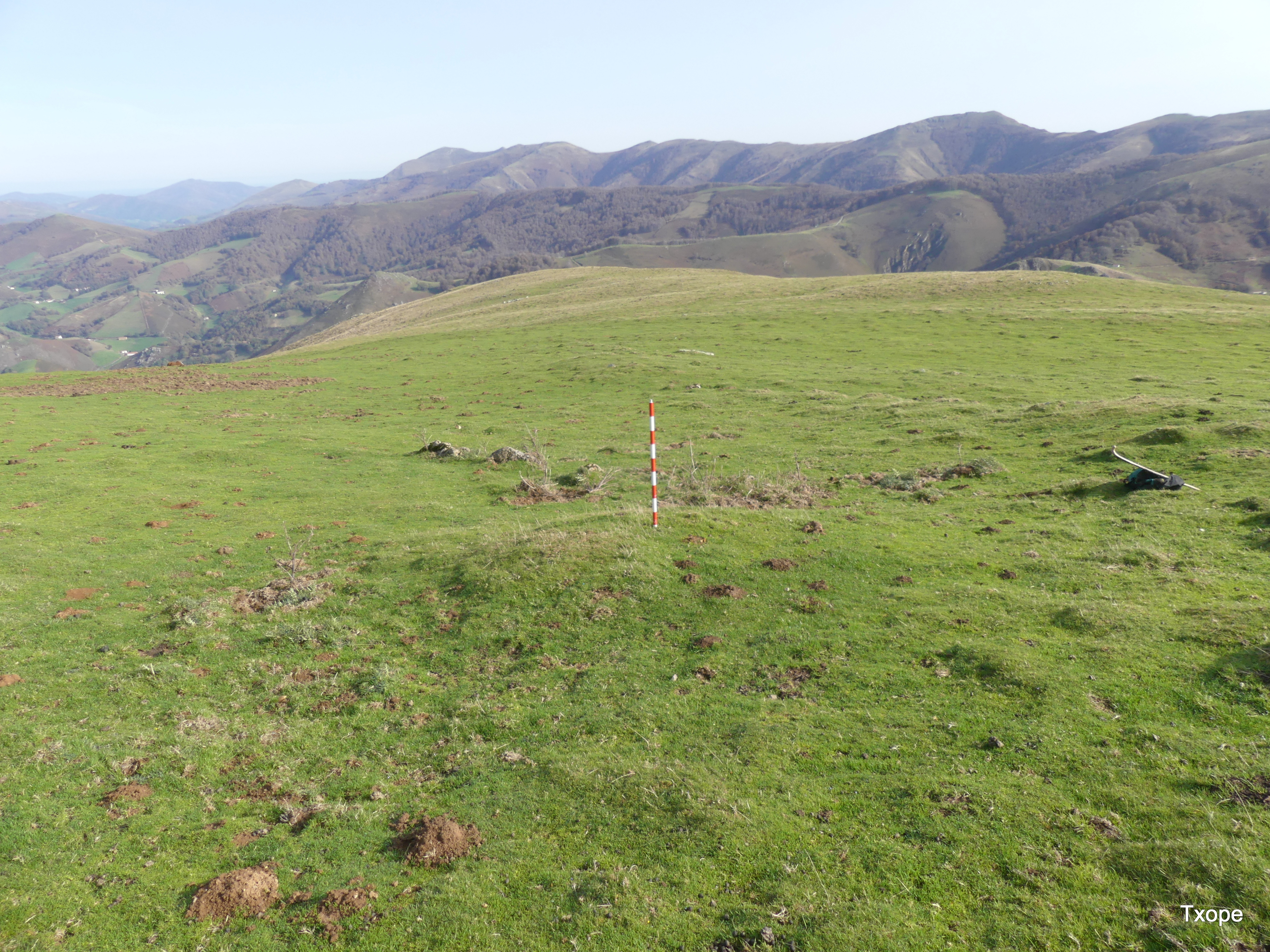 BEARDEGIKOGAÑA T-3, ERROIBAR LOCALIZACIÓN Coordenadas UTM, ETRS-89, X: 629.991, Y: 4,765.321, Z: 1121 Erroibar-Valle? de Erro TOPONIMIA Beardegikogaña CONTEXTO PAISAJISTICO Pastizales de Montaña DESCRIPCIÓN Pequeño túmulo funerario en terreno despajado y suave ladera, perfectamente definido, aunque no se aprecia peristalito. TIPOLOGÍA Diámetro: 4 m Altura: 0,80 m Cronología: Edad del Hierro Emplazamiento: Ladera USO DEL SUELO PolÃgono: 23, Parcela rústica: 25, Subparcela: Y. Grupo: Forestal no arbolado, Cobertura principal: Pastizal de Alta montaña, recinto: 7774 INTERPRETACIÓN Y VALORACIÓN Túmulo funerario cercano a otros dos, un menhir y un crómlech, localizado en la ladera Este de Sorolepo donde se localizan otro menhir y un dolmen así como varios fondos de cabaña. En 1948, José Miguel de Barandiaran, catalogó en esta ladera un túmulo, un crómlech y un dolmen en Beardegi. MATERIALES No disponemos de ningún material CONSERVACIÓN Se halla perfectamente conservado y sin muestras aparentes de saqueo o profanación CIRCUNSTANCIAS DEL HALLAZGO Prospección pedestre de Juan Mari Martínez Txoperena, el 24 de septiembre del 2020 BIBLIOGRAFÍA http://wiki.txoperena.es/tiki-index.php?page=Beardegikogaina+C | ||