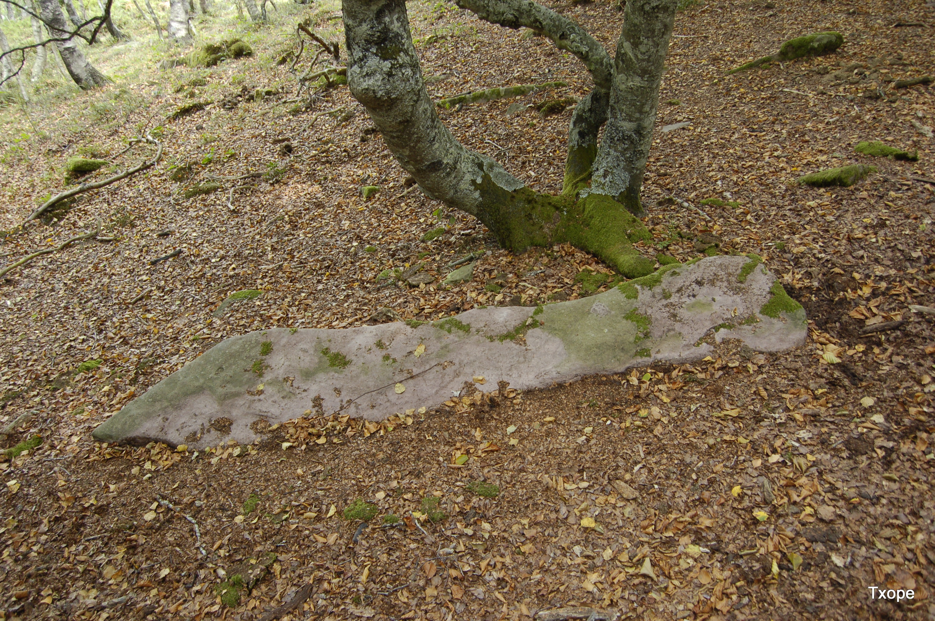 LOCALIZACIÓN Iriberri, Artzibar TOPONIMIA Lendergibel CONTEXTO PAISAJISTICO Se localiza en un pastizal de altura cerca del borde, aunque dentro de un hayedo y próximo a los dólmenes 1 y 2 de Lendergibel, se trata de un paraje donde afloran areniscas triásicas en abundancia, donde se aprecia un buen número de pequeños túmulos bien consolidados, claro que sin una intervención arqueológica no podemos confirmar su caracter funerário y también pudieran ser, simples morcueros de limpieza de pastos. HISTORIOGRAFÃA inedito DESCRIPCIÓN Monolito con forma alargada terminada en punta, con un perfil de aspecto antropomorfo. Eje máximo: 2,50 m Eje mÃnimo: 0,30 m Grueso: 0,25 m CronologÃa: Edad del Bronce-Hierro? Emplazamiento: Cerro USO DEL SUELO PolÃgono: 34; Parcela rústica: 45; Sub parcela: A Grupo: Frondosas; Cobertura principal; Hayas (Fagus silvática; Recinto: 10283 INTERPRETACIÓN Y VALORACIÓN Monolito tumbado sin evidencia actual de haber estado hincado, si asà fuera, por la situación donde se encuentra, pudo tener caracter direccional, auque en la actualidad, tampoco se aprecia trabajo intencionado evidente. CONSERVACIÓN Buena CIRCUNSTANCIAS DEL HALLAZGO Prospección pedestre, de Juan Mari MartÃnez Txoperena el 31 de agosto del 2011. | ||