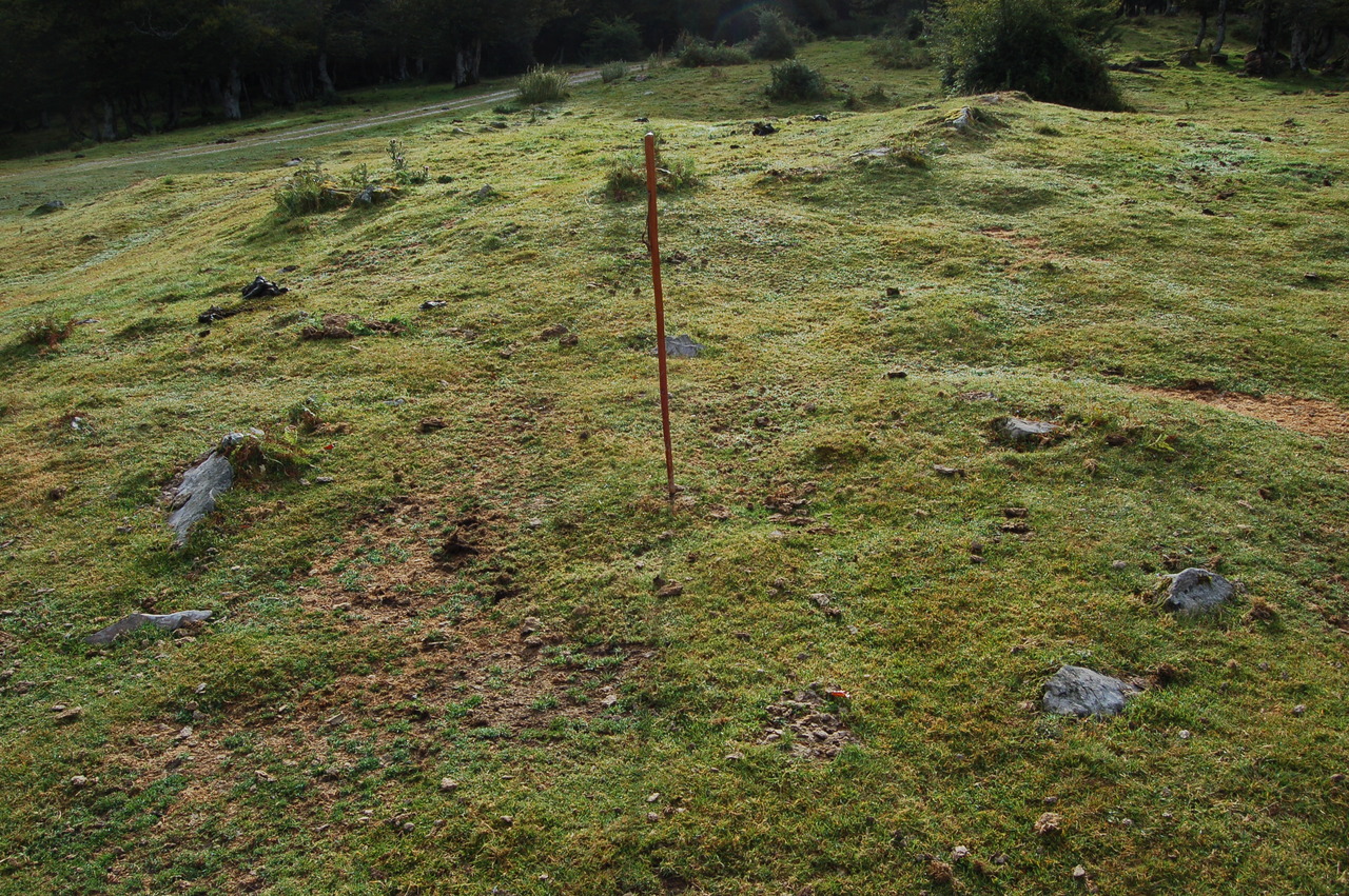Se localiza en la parte baja del collado, al este del aska o abrevadero y junto a una estructura ovalada o fondo de cabaña. Se trata de un peristalito de piedras que apenas sobresalen del terreno. Nos ofrecía alguna duda pero tras contrastar otras opiniones nos atrevemos a denunciarlo. Coordenadas UTM. ED-50, X: 630 555, Y: 4 763 460, Z: 1044 Coordenadas UTM, ETRS-89, X: 630.452, Y: 4.763.251, Z: 1044 Datos tomados el día: 24-9-05 a las 13,40 horas Diámetro: 3 m y vemos 11 testigos MTN. 1: 25000. H.91-III (51-12) Olaberri Término Municipal de: Erroibar Localizado por: Juan Mari Martínez Txoperena, el 24-9-2005 Zona 27, Sorogain-Ibañeta | ||