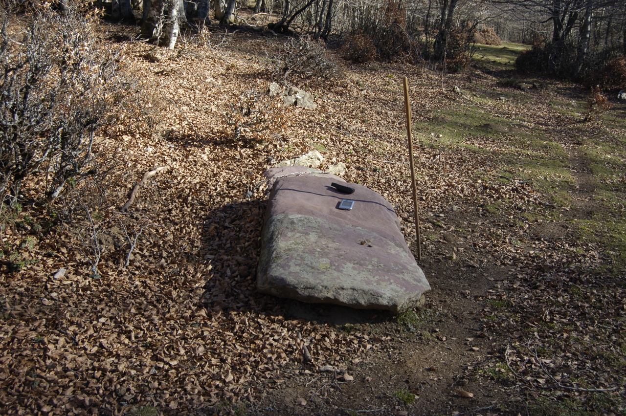 En el centro del collado entre el Monte Baigura y el Motxorro, vemos tumbado y partido este monolito, observamos, que en este collado afloran calizas en lugar de las areniscas rojizas habituales, por lo que deducimos que tuvo que ser transportado a este lugar, aunque no de muy lejos. También, creemos ver trabajo intencionado en él y el sitio igualmente nos sugiere este carácter. Coordenadas UTM, ED-50, X: 644.254, Y: 4.747.542, Z: 1381 Coordenadas UTM, ETRS-89, X: 644.151, Y: 4.747.333, Z: 1381 Datos tomados el 13-1-07 a las 11,57 horas Largo máximo: 2,50 m Ancho máximo: 0,95 m Grueso máximo: 0,30 m MTN. 1: 25.000. H.116-IV (52-14) Oroz Betelu Término Municipal de: Urraul Alto (Aristu) Localizado por: Barrero, Gaztelu, Mercader, Millán el 28-6-2003 Zona 43 Baigura-Salazar | ||