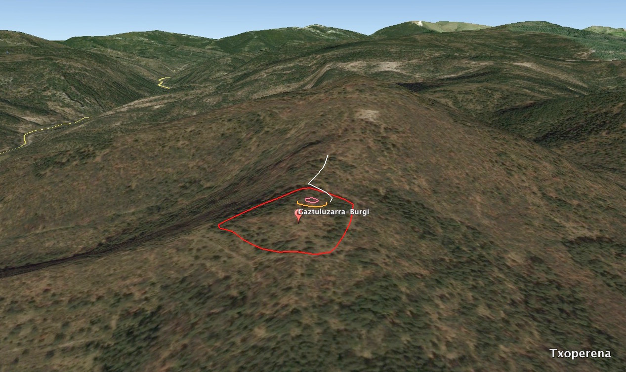 Gaztuluzarra-Burgui• Coordenadas: ETRS-89, X: 663.752, Y: 4.734.620, Z: 845 • TipologÃa: Lugar de habitación, núcleo de población • Superficie fortificada: 9.700 m2 • PerÃmetro fortificado: 380 m • Eje máximo: 131 m • Eje mÃnimo: 107 m • CronologÃa: Hierro • Emplazamiento: Cerro • Término municipal: Burgui • PolÃgono: 8, parcelas rústicas: 145, 146 • Grupo: Frondosas, cobertura principal: Roble pubescente (Quercus pubescens), recinto 2610 • Entorno: Promontorio sin mucha relevancia encima del Camino Real de Burgui a Vidangoz, actualmente poblado de bojes, robles y matorrales en general, con buen dominio visual hacia el sur, este importante camino no tiene el mismo uso que tubo y se encuentra jalonado con abundantes bordas, algunas todavÃa empleadas aunque no se les de la misma utilidad que antaño. • Conservación: Nos parece que se encuentra en deficiente estado, el terraplén que protegÃa este emplazamiento se halla totalmente camuflado por la vegetación de las laderas y en la cumbre solo se aprecia unos amontonamientos de piedra restos de alguna pequeña construcción para la que se realizo una plataforma circular para habilitar un espacio delante de ella. • Materiales: no se han recogido • Circunstancias del hallazgo: Prospección de Juan Mari MartÃnez Txoperena y Rafa Zubiria Mujika, en el contexto del poblamiento protohistórico pirenaico a la llegada de los romanos. Localizado: El 5 de septiembre del 2015 • Valoración del yacimiento: No estamos suficientemente convencidos del carácter de este emplazamiento, a pesar del topónimo que nos animo a visitarlo, además del topónimo vemos evidencias que nos dan razones para creer que pueda tratarse de un punto de vigilancia, control del territorio, del camino y de comunicación, no lo vemos como un castro defensivo y mucho menos castillo de ningún genero, solo el terraplén advertido en el mapa de relieve del LIDAR, es para nosotros, un indicio que pueda tratarse de un trabajo de la protohistoria, pero se necesitarÃa un sondeo arqueológico para poderlo afirmar. De cualquier forma somos partidarios de reseñarlo por las observaciones indicadas.