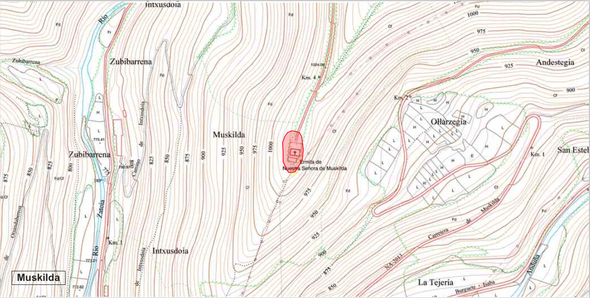 LOCALIZACIÓN Término municipal de Otsagabia Coordenadas ETRS-89, X: 656.253, Y: 4.753.157, Z: 1020 TOPONIMIA Muskilda CONTEXTO PAISAJISTICO Pronunciado cerro al Norte de la localidad, en cuya cumbre se encuentra el santuario de Nuestra Señora de Muskilda, de gran arraigo popular, mantenido por la cofradÃa homónima. Por su cumbre pasa la vieja ruta que desde el paso se Egurgio en Irati, asciende a la sierra de Abodi y desciende por Arrizabala, también llamado Paso de las Alforjas (GR-11). Antaño sus laderas se utilizaban como tierras de labor agrÃcolas, hoy forestadas en su mayor parte. HISTORIOGRAFÃA Inédito como castro DESCRIPCIÓN Recinto fortificado de planta oval, a base de grandes terraplenes que interiormente guardan potentes murallas de piedra. Se encuentra muy alterado desde época antigua, en él se construyo una ermita bajo la advocación de nuestra Señora de Muskilda, que nos hace sospechar del carácter de santuario ya en la Edad del Hierro y época romana. TIPOLOGÃA Núcleo de población Superficie fortificada: 7.500 m2 PerÃmetro fortificado: 355 m Eje máximo: 135 m Eje mÃnimo: 55 m CronologÃa: Hierro Emplazamiento: Loma USO DEL SUELO PolÃgono: 2; Parcela rústica: 308; Subparcelas: A,B,C Grupo: Frondosas, Cobertura principal: Hayas (Fagus sylvatica); Recinto 12440 INTERPRETACIÓN Y VALORACIÓN La existencia desde la antigüedad de la ermita, nos hace especular si ya en la Edad del Hierro tendrÃa el carácter de santuario. El gran arraigo y tradición, no solo en Otsagabia sino, en todo Salazar nos hace pensar que fuera asà antes del cristianismo. De cualquier forma, su localización en este lugar, denota un interés en controlar la antigua ruta pecuaria entre los altos pastos de Abodi y el valle del Salazar y a la vez servir de refugio en caso de necesidad a los asentados junto al rÃo. MATERIALES No se han recogido. CONSERVACIÓN A pesar de la acusada antropización del lugar, creemos que puede haberse conservado estratigrafÃa, aunque no en la parte alta ocupada por el edificio religioso, pues este complejo habrá borrado todo resto del antiguo poblado. Aparte de los terraplenes laterales donde apreciamos restos de murallas, poco podemos decir del acceso pues la vegetación impide la visión y nada hemos podido identificar con un mÃnimo de seguridad, aunque bien pudo hacerse por la loma Sur, acceso tradicional del santuario desde el pueblo haciéndolo circular bajo la muralla occidental y el foso Norte. A hacerse la carretera actual por el Norte se relleno el posible foso que dificultaba el acceso desde esta zona donde se pueden ver restos de fuertes muros, posiblemente pertenecientes a la escarpa del mismo. CIRCUNSTANCIAS DEL HALLAZGO Prospección de Zuriñe Iturri Lizoain y Juan Mari MartÃnez Txoperena, en el contexto del poblamiento protohistórico pirenaico a la llegada de los romanos el 8 de abril del 2017. BIBLIOGRAFÃA