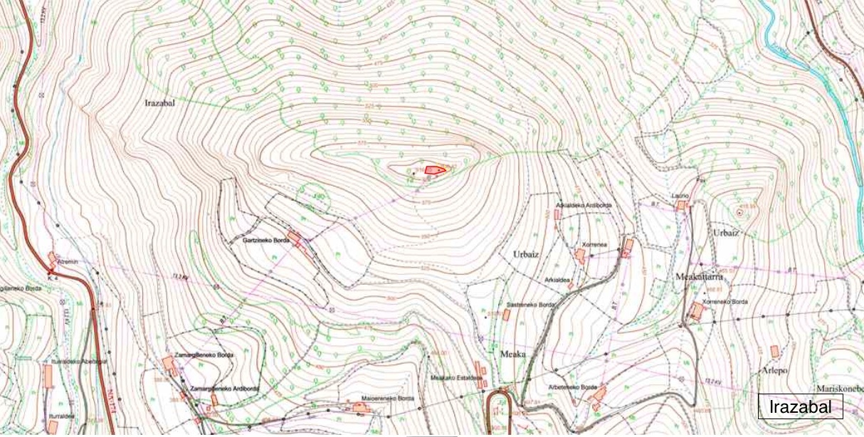 LOCALIZACIÓN Término municipal de Baztan Coordenadas UTM, 30-N, ETRS-89, X: 620.009, Y: 4.773.396, Z: 608 Coordenadas UTM. ED-50, X: 620.094, Y: 4.773.607, Z: 608 TOPONIMIA Irazabal CONTEXTO PAISAJISTICO OrografÃa muy accidentada principalmente cubierta por bosque de hayas, helechales con bordas y algún prado, en la vertiente Sur, por la que circula la carretera NA-174 de Quinto Real a Irurita. HISTORIOGRAFÃA Inédito DESCRIPCIÓN Se trata de una edificación con mampuestos en seco situada en lo alto de un puntiagudo afloramiento de areniscas triásicas, con extenso dominio visual y control de una importante ruta pecuaria que desciende del collado de Artesiaga a la vertiente Cantábrica. No es un poblado pues apenas tiene espacio para una vivienda. TIPOLOGÃA Pequeño espacio de vigilancia y control Superficie fortificada: 445 m2 PerÃmetro fortificado: 101 m Eje máximo: 38 m Eje mÃnimo: 15 m CronologÃa: Hierro-Alto? medieval Emplazamiento: Cerro USO DEL SUELO PolÃgono: 70; Parcela rústica: 173, (sub-parcela S) Grupo: Frondosas; Cobertura principal: Hayas (Fagus sylvatica); Recinto 6064 INTERPRETACIÓN Y VALORACIÓN La importancia de esta localización viene dada por tratarse de emplazamiento de vigilancia, sin duda, relacionado con el paso de Artesiaga, ruta de comunicación de los valles pirenaicos con el de Baztan y la vertiente cantábrica, por tanto, elemento esencial en el sistema de control y testigo de la articulación defensiva de Baztan en épocas pretéritas. De todas formas no podemos tener una seguridad en la asignación a una época determinada sin una intervención arqueológica que aporte evidencias. MATERIALES No disponemos de ningún material. CONSERVACIÓN Muy deteriorado, con evidencia de haber sido destruido intencionadamente, con los bloques de areniscas triásicas de su estructura, extraÃdos en el propio lugar y hechos rodar pendiente abajo, de manera que in situ, a la vista quedan pocas hiladas de sus paredes, aunque las suficientes para reconocer su planta. Mas difÃcil es adivinar su acceso, de cualquier forma difÃcil por la violencia de las laderas. CIRCUNSTANCIAS DEL HALLAZGO Prospección de Juan Mari MartÃnez Txoperena, en el contexto del poblamiento protohistórico pirenaico a la llegada de los romanos, el 13 de febrero del 2011 BIBLIOGRAFÃA | ||