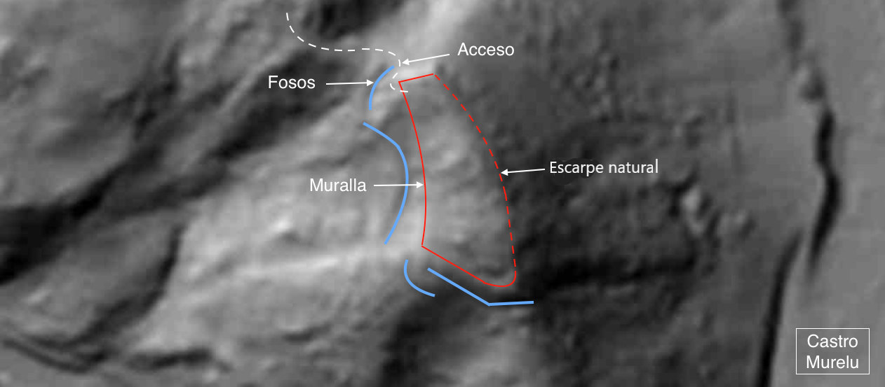 LOCALIZACIÓN Término municipal de Esteribar Coordenadas UTM. ETRS-89, X: 621.673, Y: 4.754.837, Z: 655 Coordenadas UTM. ED-50, X: 621.813, Y: 4.755.002, Z: 655 TOPONIMIA Murelu CONTEXTO PAISAJISTICO Cerro situado inmediatamente al Oeste de la localidad de Zubiri actualmente colonizado por pino silvestre y sotobosque de boj, con un sendero que lo atraviesa, único acceso practicable, la fauna habitual es el Ciervo, JabalÃ, Corzo, Zorro, Tejón, Turon, Gato montes, Marta, Fuina, Gineta, Comadreja y anidan el Ratonero común, Milano Real, Gavilán, Azor, Pito negro, Pito real, Pito picapinos, Cuervo, Corneja, Chova, Arrendajo y una amplia lista de aves menores. HISTORIOGRAFÃA Inédito DESCRIPCIÓN Castro de planta poligonal alargada situado en la cima de un cerro e inmediato a la localidad de Zubiri y el rÃo Arga. Este encastramiento utiliza escarpes naturales y fuertes pendientes, que con la ayuda de la poliorcética aplicada consistente en taludes, fosos y murallas, consiguieron un recinto con la suficiente extensión y seguridad. Al Norte excavaron un foso y creemos que al Este también, aunque la vegetación y la utilización histórica de estas tierras para labores agrÃcolas los hayan colmatado. TIPOLOGÃA Núcleo de población Superficie fortificada: 16.700 m2 PerÃmetro fortificado: 565 m Eje máximo: 230 m Eje mÃnimo: 80 m CronologÃa: Hierro Emplazamiento: Cerro USO DEL SUELO PolÃgono: 29; Parcelas rústicas: 111, 112 PolÃgono: 27; Parcelas rústicas: 137, 144; Subparcela: A Grupo: ConÃferas; Cobertura principal: Pino silvestre (pinus sylvestris); Recinto 12487 Grupo: ConÃferas; Cobertura principal: Pino laricio (Pinus nigra); Recinto 12605 Grupo: ConÃferas; Cobertura principal: Pino silvestre; Recinto 11847 INTERPRETACIÓN Y VALORACIÓN El topónimo Murelu (Muru-Murillo) nos dio la primera pista del carácter de este emplazamiento, asà comprobamos que se trataba de un recinto fortificado. Por el Este aprovecha un fuerte escarpe natural del que no podemos precisar si necesito reforzamiento antrópico, debido a la espesura de la vegetación de boj que la recubre. Al Norte además del acceso al recinto mantiene dos fosos paralelos con muro en la contraescarpa intermedia y al interior apreciamos una muralla, de momento no podemos determinar las dimensiones del grueso de esta al encontrarse muy integrada y se necesitarÃa intervenir sobre el terreno para determinarla. Las defensas se componen de fuertes taludes, con la posibilidad que escondan murallas petrificadas, de hecho se puede ver en un deslizamiento del la misma e incluso se han podido reciclar sus materiales en labores de construcción y cercado de fincas, pues hay indicios sobre el terreno de acopios para este uso. En la loma Sur además de dos lÃneas de defensa, existe la posibilidad de otra defensa adelantada en forma de talud, que se reforzarÃa adecuadamente, como protección adicional a esta zona sensible. Dentro del recinto, hemos observado la cimentación de un recinto rectangular, aunque la vegetación de pinos con espeso sotobosque de boj y jinebros impide una buena prospección visual, de todas maneras no creemos que pertenezca a una estructura protohistórica y es posible que sea de una construcción pecuaria moderna. No hemos visto ningún resto de industria, para poder confirmar una adscripción temporal a este emplazamiento, solo sus clásicos terraplenes y fosos nos dan datos para su caracterización. MATERIALES No se han recogido. CONSERVACIÓN Estamos seguros de la buena conservación, teniendo en cuenta el uso actual y el antiguo que se aprecia en la orto-fotografÃa histórica, se aprecia alguna afección en los terraplenes por deslizamientos, quedando al descubierto su estructura y acopio consiguiente de materiales pétreos para su reciclado con amontonamientos sobre el terreno. CIRCUNSTANCIAS DEL HALLAZGO Prospección de Miguel Etxegarai Agara y Juan Mari MartÃnez Txoperena, en el contexto del poblamiento protohistórico pirenaico de la calzada romana y su entorno, el 24 de febrero del 2012 BIBLIOGRAFÃA | ||