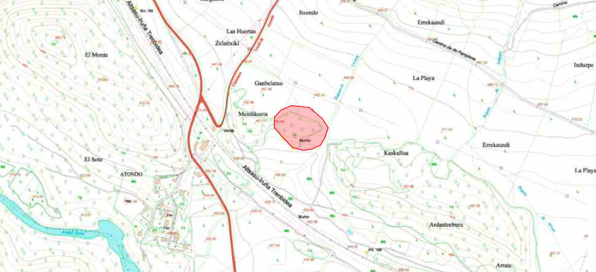 LOCALIZACIÓN Término municipal de Arakil Coordenadas: ETRS-89, X: 597.679, Y: 4.750.450, Z: 568 TOPONIMIA Murubi CONTEXTO PAISAJISTICO Cerro completamente cubierto por bosque de robles, bajo el cual, por el Sur discurre la autovÃa A-15 y por el Norte la antigua carretera N-240, a pesar de todo conserva una buena ecologÃa y no está ausente la habitual fauna de la zona como jabali, corzo, zorro, tejón, Gato montes, marta, fuina, gineta etc.. HISTORIOGRAFÃA Inédito DESCRIPCIÓN Recinto fortificado de planta triangular con grandes terraplenes donde apreciamos restos de la muralla que reforzaba estos taludes. Localizado en la cumbre de un cerro aprovecha las fuertes pendientes de sus laderas para con sencilla poliorcética conseguir un recinto suficientemente seguro. TIPOLOGÃA Núcleo de población Superficie fortificada: 6.600 m2 PerÃmetro fortificado: 310 m Eje máximo: 100 m Eje mÃnimo: 89 m CronologÃa: Hierro Emplazamiento: Cerro USO DEL SUELO PolÃgono: 5; Parcela rústica: 330 Grupo: Frondosas; Cobertura principal: Roble pubescente (Robus pubescens); Recinto 15505 Grupo: Frondosas; Cobertura principal: Carrascas (Quercus rotundifolia); Recinto 15361 INTERPRETACIÓN Y VALORACIÓN Bonito emplazamiento desplazado del curso del rÃo Arakil, controlando los pasillos de Izurdiaga, Aitzkorbe, Gulina y Osinaga, cuatro importantes rutas de comunicación en la antigüedad y buena comunicación con el valle del Arakil al Oeste. En el cerco superior, mantiene un terraplén potente en todo su perÃmetro con abundantes piedras de la muralla derruida, una plataforma adelantada en el collado de mas fácil acceso con dos someros fosos laterales en esta. MATERIALES Tenemos información de la recogida de cerámica manufacturada aunque no la hemos visionado. CONSERVACIÓN Presumiblemente buena, no ha sido conquistado para la agricultura, por tanto la afección solo puede venir de las raÃces del arbolado y las explotaciones forestales. CIRCUNSTANCIAS DEL HALLAZGO Circunstancias del hallazgo: Prospección por ciber-detección topográfica de Miguel Echegarai Agara en 2007, comprobado por Juan Mari MartÃnez Txoperena, el 20 de agosto del 2015 BIBLIOGRAFÃA | ||