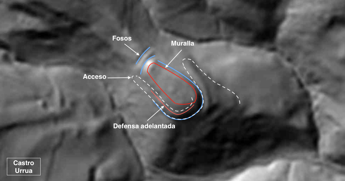 • Coordenadas: ETRS-89, X: 653.485, Y: 4.752.005, Z: 909 • Clasificación cultural: Hierro I • TipologÃa: Lugar de habitación, núcleo de población • Superficie fortificada: 5.850 m2 • PerÃmetro fortificado: 315 m • Eje máximo: 124 m • Eje MÃnimo: 50 m • Emplazamiento: Cerro • Término municipal: Ezkaroze-Ezcaroz? • PolÃgono: 1; Parcelas rústicas: 67,72,75 • Grupo: Frondosas; Cobertura principal: haya (fagus sylvatica); Recinto: 14295 • Entorno: Es un terreno de aprovechamiento mixto de praderas, bordas y bosque de frondosas donde predomina el pino silvestre (Pinus sylvestris), haya y matorral de avellanos (Corylus avellana), Boj (Buxux sempervirens l.), Espinos (Crataegus oxyacantha), Pacharanes (Prunus spinosa), Acebo (Ilex aquifolium), Rosal silvestre (Rosa canina), y Zarza (Robus fruticosus), frecuentados por el JabalÃ, Ciervo , Corzo, Zorro, Tejón, Marta, Fuina, Turón, Comadreja y anida el Pito negro, Pito real, Pito picapinos, Cuervo, Corneja, Arrendajo y una larga lista de aves menores; la orografÃa es accidentada pero muy humanizada por siglos de practicas ganaderas y con abundantes caminos y pistas modernas. • Conservación: Se encuentra en inmejorables condiciones teniendo en cuenta el tiempo transcurrido, principalmente por haberse reservado inhábil para la agricultura, mantiene muy bien definidos los fosos y terraplenes, estos coronados con restos de paredes pétreas, también se aprecian paredes de mamposterÃa en seco avanzadas en ladera conjuntamente con plataformas amplias y bien conformadas, por tanto la afección mas grave es la producida por la vegetación y raÃces de los árboles algunos de gran porte y el propio clima húmedo y lluvioso. • Materiales: Solo dos pequeños fragmentos de cerámica manufacturada recogidos en una topera. • Circunstancia del hallazgo: Prospección de Juan Mari MartÃnez Txoperena en el contexto del poblamiento protohistórico pirenaico de la calzada romana y su entorno, localizado: 13 de junio del 2015 • Valoración: Alta, tanto por la poliorcética, la conservación, como por la ubicación geográfica en el entorno inmediato a la alta montaña, le confieren un valor añadido importante, para el conocimiento del tipo de vida y recursos que disponÃan los nativos en esta época en el ámbito pirenaico. Mas tratándose de un ejemplo castreño por sus caracterÃsticas de fortaleza, dotada de los medios necesarios para su inexpugnabilidad, en un medio, de por si ya hostil y aparentemente aislado, pero que denotan precisamente lo contrario. Los castros mas cercanos los tiene en Irungaztelu 2.200 m (Jaurrieta), Krutxaldea 3.300 m (Otsagabia), Urrua de Algarra 4.300 m (Ezcaroz), Aixkourrua 4.700 m (Otsagabia), La Cerca 6.200 (FacerÃa 9) | ||