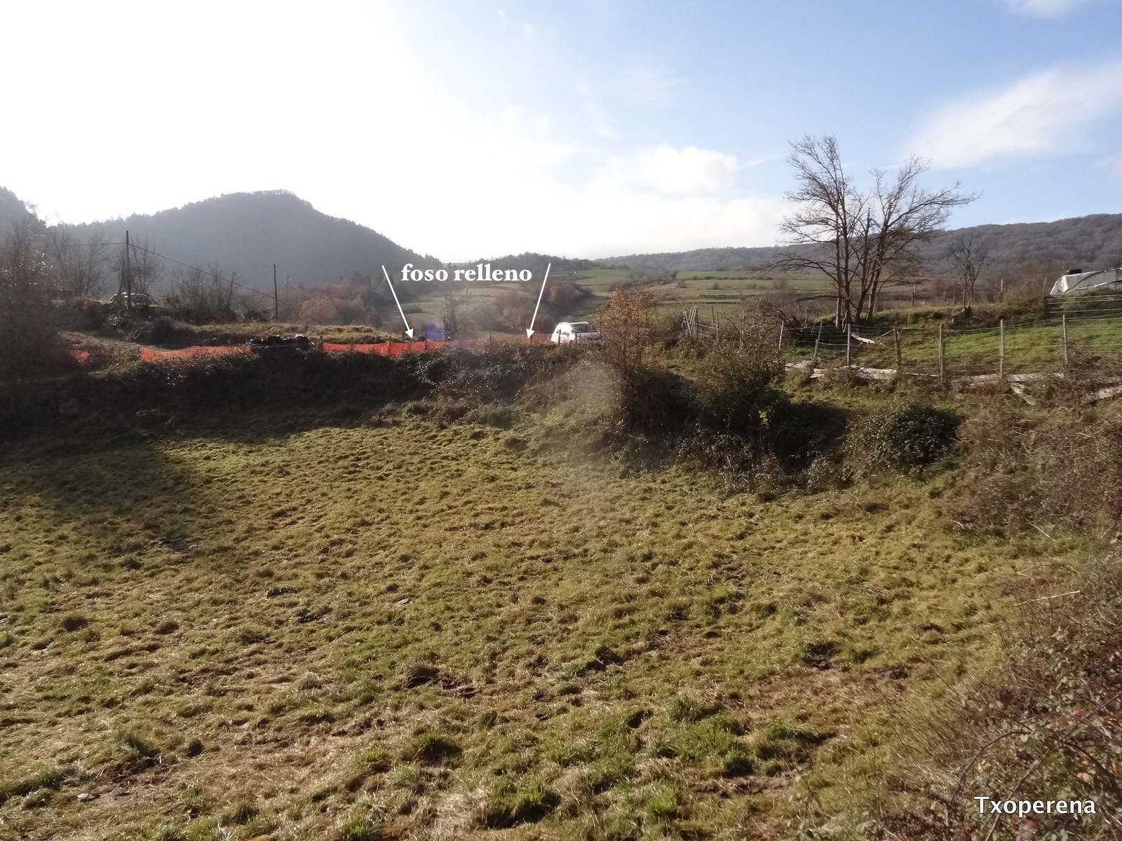 • Coordenadas: ETRS-89, X: 645.560, Y: 4.752.515, Z: 892 • TipologÃa: Lugar de habitación, núcleo de población • Superficie fortificada: 9.150 m2 • PerÃmetro fortificado: 485 m • Eje máximo: 208 m • Eje mÃnimo: 40 m • CronologÃa: Hierro • Emplazamiento: Cerro • Término municipal: Abaurrepea-Abaurrea? Baja • PolÃgono: 2, parcela rústica 638 (sub-parcelas B,E) • Grupo: Herbáceos de secano, Cobertura principal Praderas, recinto 13402 • Entorno: Encima del casco urbano en un cerro secularmente utilizado para la agricultura, actualmente como praderas. • Conservación: Por lo que se puede apreciar nos parece que se encuentra bastante arrasado, la proximidad con la población hace presumir una continua utilización a través del tiempo de sus materiales pétreos para la construcción. El topónimo Gurutzealdea es un sÃntoma de sustitución de un recuerdo anterior al cristianismo bajo la advocación de la Cruz, indicio de un poblamiento anterior, que en Navarra se repite con asiduidad. • Materiales: No disponemos de materiales • Circunstancias del hallazgo: Prospección de José Etxegoien Juanarena, Juan Mari MartÃnez Txoperena y Rafa Zubiria Mujika, en el contexto del poblamiento protohistórico pirenaico a la llegada de los romanos.Localizado el 12 de diciembre del 2015. • Valoración del yacimiento: Para la propuesta que hacemos de este poblado se apoya en la orografÃa, la costumbre e indicios de foso y terraplenes, reconociendo que son débiles, lo achacamos a la lógica alteración del largo tiempo transcurrido utilizando estos terrenos para la agricultura, que ha desdibujado su poliorcética y reutilizado los restos constructivos históricamente, la propia localidad actual es otro indicio de la existencia de un asentamiento anterior, bajando de un incómodo cerro a su ladera mejor protegida de los vientos dominantes. Las condiciones orográficas también son un argumento pues el perÃmetro en su parte Suroeste, Oeste y Norte, necesitaba poca atención por su fuerte pendiente que hacia inviable un ataque por estos escarpes y la única zona débil estaba protegida por un pequeño foso de manera que solo la zona Este necesitaba estructuras defensivas artificiales de cierta entidad | ||