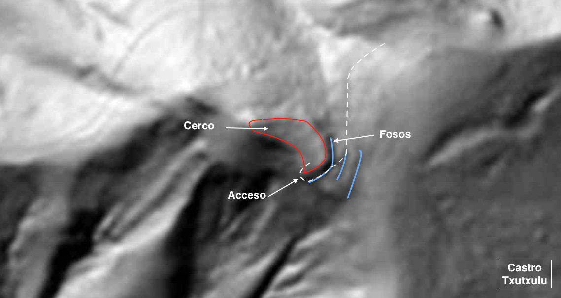 • Coordenadas: ETRS-89, X: 637.759, Y: 4.744.133, Z: 853 • TipologÃa: Núcleo de población • Superficie fortificada: 3.900 m2 • PerÃmetro fortificado: 295 m • Eje máximo: 106 m • Eje mÃnimo: 40 m • CronologÃa: Hierro • Emplazamiento: Cerro • Término municipal:Urraul Bajo • PolÃgono: 12; Parcelas rústicas: 12; Subparcelas: M, K; Parcela rústica: 19 Subparcelas: B, K. • Grupo: Forestal no arbolado; Cobertura principal: Matorral arbolado; Recinto: 19628 Grupo: ConÃferas; Cobertura principal: Pino silvestre (Pinus sylvestris); Recinto: 19123 • Entorno: Es un paisaje de pinares, pastos y afloramientos de margas, de poco fondo vegetal, donde prosperan bojes, espinos, pacharanes, enebros y rosa canina como matorrales mas comunes juntamente con ollagas y zarzas y hacen difÃcil en poder circular sobre todo en el recinto fortificado y su entorno inmediato; es frecuentado por el JabalÃ, Corzo, Zorro, Tejón, Marta, Turón, Fuina, Comadreja, Pito real, Pito picapinos, Cuervo, Corneja, Arrendajo y una larga lista de aves menores y donde se observa el Quebrantahuesos, Alimoche y Ãguila real con bastante asiduidad. • Conservación: Parece mantenerse en buenas condiciones, aunque es probable que se haya utilizado con fines agrÃcolas, los fosos se mantienen reconocibles y aunque derruida entre bojes, se comprueba un tramo de muralla de 75 m • Materiales: No se han recogido. • Circunstancias del hallazgo: Prospección visual de Javier Diez Huguet, José Etxegoien Juanarena y Juan Mari MartÃnez Txoperena, en el contexto del poblamiento protohistórico pirenaico a la llegada de los romanos, localizado el 5 de mayo del 2016. • Valoración del yacimiento: Vemos un recinto fortificado de poliorcética adaptada al terreno, con la zona oriental como parte mas vulnerable del enclave, defendida por potente muralla y doble foso paralelo y el resto del perÃmetro de escarpes naturales aprovechados para su aislamiento y protección. De dimensiones habituales entre los recintos fortificados del Pirineo y en conexión visual con el de Peña Gaztelu, Los Geronales, Moriskoa, Alto de la Peña, Asnoz y El Castillo en Gorraiz, dentro de un árido territorio hoy desolado pero altamente habitado hasta la edad media | ||