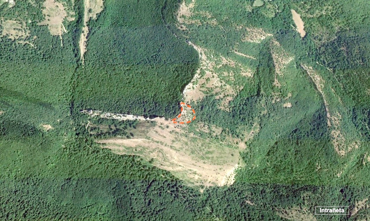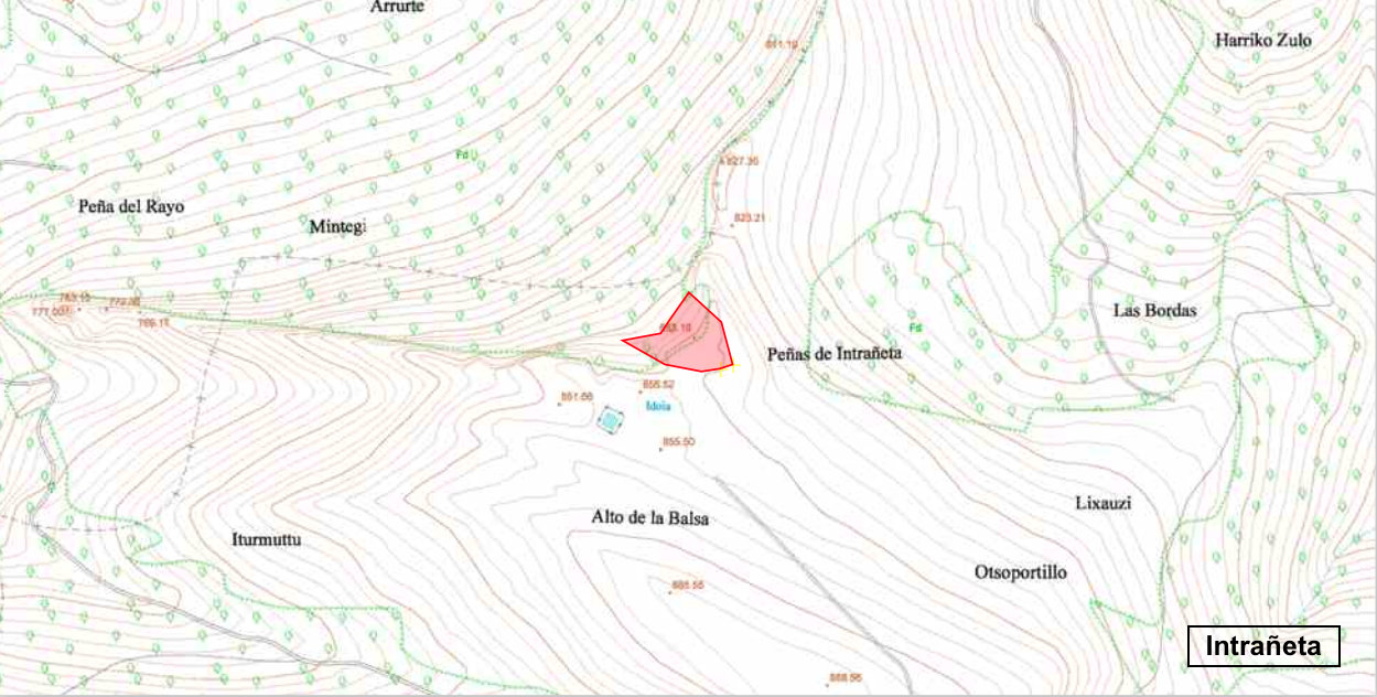 LOCALIZACIÓN Término municipal de Arakil Coordenadas ETRS-89, X: TOPONIMIA Intrañeta CONTEXTO PAISAJISTICO Rellano de ladera al Norte de la Sierra de Satrustegi, se trata de un afloramiento de calizas a media altura entre el valle y la cumbre de la sierra, en un terreno de pastizales naturales y escarpes calizos. HISTORIOGRAFÃA Inédito DESCRIPCIÓN Situado al Sur de la localidad de Ekai, en la ladera Norte de la sierra de Satrustegi dentro de un raso sin ningún tipo de lÃmite o delimitación que lo distinga, si no es, que los restos aparecen entre afloramientos calizos TIPOLOGÃA Asentamiento al aire libre Superficie: 3.625 m2 PerÃmetro: 255 m Eje máximo: 65 m Eje mÃnimo: 55 m CronologÃa: Bronce-Hierro? I Emplazamiento: Asentamiento en altura USO DEL SUELO PolÃgono: 9; Parcela rústica: 254 (sub-parcela N) Grupo: Forestal no Arbolado; Cobertura principal: Pastizal; Recinto 16072 INTERPRETACIÓN Y VALORACIÓN Solo podemos decir que los restos aparecen en superficie, consecuencia de un pequeño asentamiento, previsiblemente al aire libre y en chozas que no han dejado evidencias. MATERIALES - 46 fragmentos de cerámica a mano. - 5 fragmentos de sÃlex (dos de ellos laminares) CONSERVACIÓN Buena CIRCUNSTANCIAS DEL HALLAZGO Prospección pedestre de Andoni Peña Lakuntza, miembro de Ezpilleta Elkartea, en el contexto del poblamiento protohistórico vascón a la llegada de los romanos, el 20 de Marzo del 2014 BIBLIOGRAFÃA Los datos han sido facilitados por su descubridor Las personas que necesiten las coordenadas, se facilitaran en < > | ||