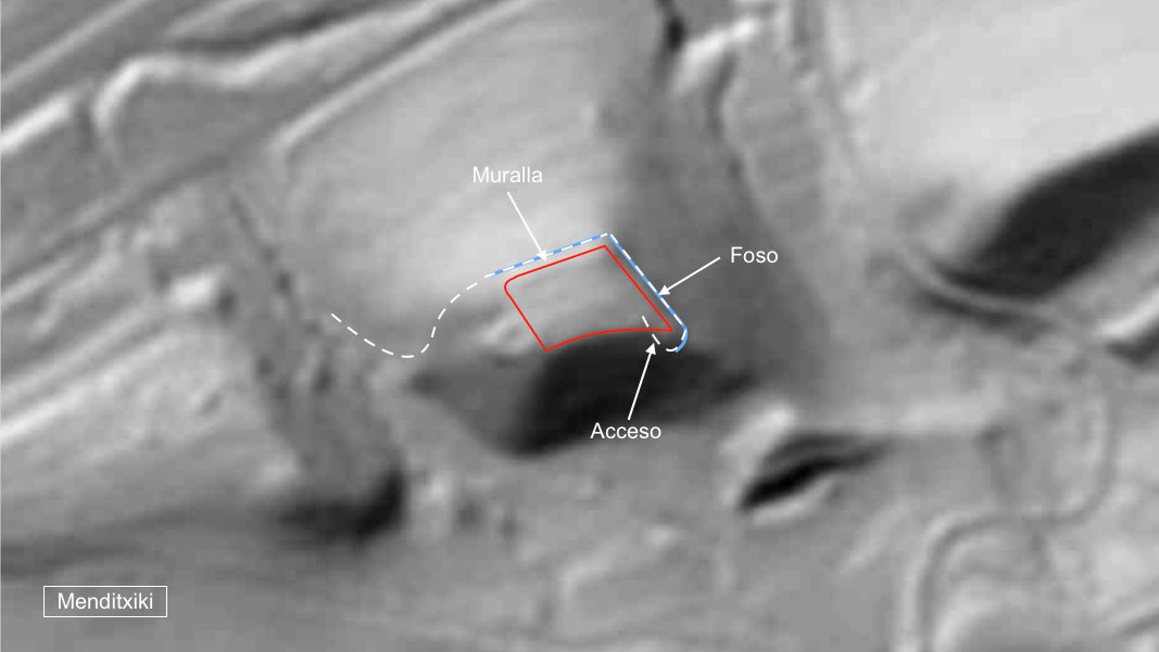 LOCALIZACIÓN Término municipal de Olazti-Olazagutia? Coordenadas: ETRS-89, X: 566.467, Y: 4. 747.839, Z: 590 TOPONIMIA Menditxiki CONTEXTO PAISAJISTICO En contexto inter-urbano, muy cerca de vÃas de comunicación y complejo industrial. Se localiza en medio del pasillo natural de la cuenca de pamplona a la llanada alavesa, entre las sierras de Urbasa, al Sur y Alzania , al Norte. A pesar de la enorme antropización conserva con holgura, las condiciones rurales tradicionales. Muy cerca vemos la ermita de San Sebastián. HISTORIOGRAFÃA Inédito DESCRIPCIÓN Recinto fortificado de planta aproximándose a rectangular situada en lo alto de un cerro amesetado de fuertes pendientes. Sobre el terreno, muy cubierto con espesa capa vegetal, apenas apreciamos terraplenes con condiciones para que contengan los cimientos y restos de las murallas, que sin duda fortificaban este castro. En toda la cara Norte se aprecia bien el foso aunque en la cara este se ve menos definido por encontrarse colmatado, del resto poco mas podemos decir, pues las condiciones en que se encuentra, no permite ver otros indicios o evidencias. TIPOLOGÃA Núcleo de Población Superficie fortificada: 3.250 m2 PerÃmetro fortificado: 250 m Eje máximo: 80 m Eje mÃnimo: 45 m CronologÃa: Hierro Emplazamiento: Cerro USO DEL SUELO PolÃgono: 9; Parcela rústica: 3.014 (sub-parcelas Q, R) Grupo: Frondosas; Cobertura principal: Roble pubescente (Quercus pubescens); Recinto 17391 Grupo: Forestal no arbolado; Cobertura principal: Pastizal; Recinto 17305 INTERPRETACIÓN Y VALORACIÓN TÃpico castro de valle situado en un promontorio de pronunciadas laderas que se utilizaron para su fortificación. De planta rectangular, fue amesetado en tres plataformas con niveles ligeramente diferenciados, protegiendo todo el conjunto con terraplenes reforzados con foso en las caras Norte y Este y coronados con una supuesta muralla de la que no se aprecian restos. Por los pocos indicios que vemos del acceso, deducimos que se realizarÃa a través del foso desde el Oeste, en sentido de las agujas del reloj hasta la esquina sur donde termina el foso y se aprecia una abertura en el terraplén a modo de entrada en el recinto. Su geo-localización en el centro del valle y cercano al rÃo, denota una función de control del paso y afirmación del territorio. MATERIALES Sin materiales CONSERVACIÓN Aparentemente debe ser buena, no apreciamos evidencias de utilización agrÃcola pero en la ladera Oeste del recinto se aprecia una cantera de tierras o arcillas, que sin dañar la plataforma alta, altera el conjunto. Los terraplenes y fosos se encuentran razonablemente definidos en buen estado pero creemos que las murallas están totalmente despojadas de sus materiales pétreos, cosa lógica, por la proximidad de la población de Olazti donde sin duda se habrán reutilizado. CIRCUNSTANCIAS DEL HALLAZGO Prospección de Javier Nuin por encargo de la Dirección de Patrimonio, Bienes Muebles y ArqueologÃa del Gobierno de Navarra a la empresa Olcairum Visitado por Juan Mari MartÃnez Txoperena, en el contexto del poblamiento protohistórico pirenaico a la llegada de los romanos. BIBLIOGRAFÃA | ||