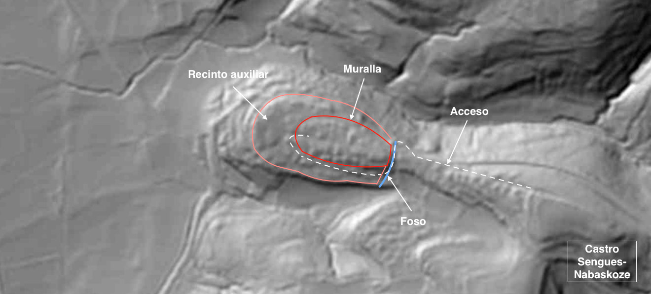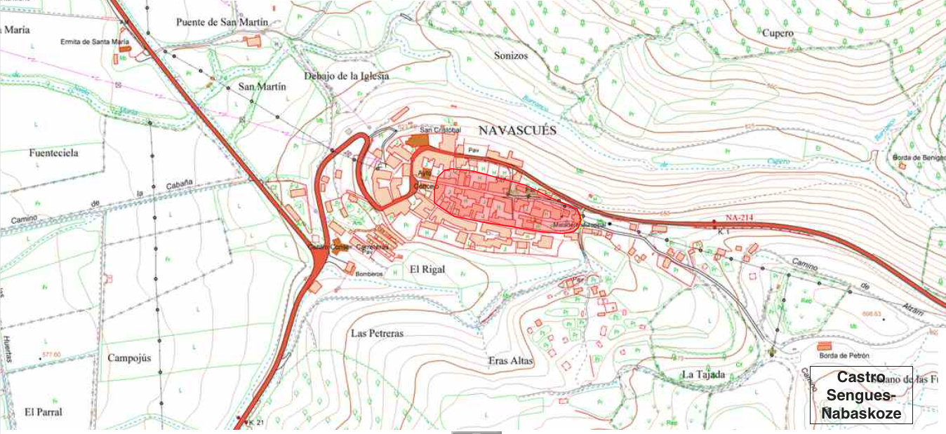 LOCALIZACIÓN Término municipal de Nabaskoze-Navascues? Coordenadas: ETRS-89, X: 654.337, Y: 4.731.262, Z: 650 TOPONIMIA Sengues-Nabaskoze? CONTEXTO PAISAJISTICO Se trata del actual casco urbano de Navascues, anteriormente llamado Sengues, cuando en 1.185 el Rey de Navarra Sancho el Sabio, concede fueros a todos los que repueblen este lugar, que se encontraba desolado. HISTORIOGRAFÃA Inédito como recinto de la Edad del Hierro DESCRIPCIÓN Se tratarÃa de parte de la actual ubicación de Navascues, de planta ovalada, ocuparÃa la parte alta de la localidad y estarÃa defendido con fuertes terraplenes, muralla y fosos y es posible que tuviera un recinto auxiliar con defensas adelantadas. El análisis del paisage, el entorno, juntamente con la orto fotografÃa histórica, nos dan indicios y la convicción de que tuviera todos estos atributos. También la documentación histórica aporta indicios de la existencia de una población precedente. En el lugar donde hoy se localiza el depósito de aguas, se localizaba una torre medieval que defendÃa la plaza y pudo sustituir a otra torre protohistórica. TIPOLOGÃA Núcleo de población Superficie fortificada: 19.425 m2 PerÃmetro fortificado: 614 m Eje máximo: 245 m Eje mÃnimo: 90 m CronologÃa: Hierro Emplazamiento: : Valle USO DEL SUELO PolÃgono: 10, Casco urbano Grupo: Improductivo; Cobertura principal: casco urbano; Recinto 28115 Grupo: Improductivo; Cobertura principal: casco urbano; Recinto 26108 Grupo: Leñosos de secano; Cobertura principal: nogal; Recinto 28044 Grupo: Leñosos de secano; Cobertura principal: nogal; Recinto 28206 INTERPRETACIÓN Y VALORACIÓN Se trata de una escarpada loma en la que se practico un foso al este que la aislaba , evitando el fácil acceso por esta zona y supuestamente una muralla en todo su perÃmetro. En principio se fortificarÃa un recinto que posteriormente necesitarÃa una ampliación adquiriendo una superficie de 49. 500 m2, para una población de cierta relevancia que en 1185 se encontraba deshabitada y destruida, a partir de esta fecha la población de Navascues que se agrupaba alrededor de la iglesia románica de Santa MarÃa del Campo traslada su residencia, rehabilitando el lugar de Sengues con el nombre de Nabaskoze-Navascues?. En base a los indicios que vemos sobre el terreno a pesar de la humanización aplicada al lugar, creemos que sin lugar a dudas, este asentamiento fue colonizado en la Edad del Hierro, las condiciones que ofrecÃa, no podÃan ser desaprovechadas. Analizando los componentes y el paisage nos reafirmamos en nuestra propuesta sobre el origen protohistórico del lugar. MATERIALES Sin materiales CONSERVACIÓN Solo un seguimiento de posibles obras futuras en el casco urbano podrÃa darnos alguna prueba material de la situación de la conservación del solar y posibles estratigrafÃas, aunque es posible que estas hayan desaparecido con la posterior antropización para la edificación del actual casco urbano. CIRCUNSTANCIAS DEL HALLAZGO Prospección de Juan Mari MartÃnez Txoperena, en el contexto del poblamiento protohistórico pirenaico a la llegada de los romanos, reconocido el 6 de junio del 2016 BIBLIOGRAFÃA | ||