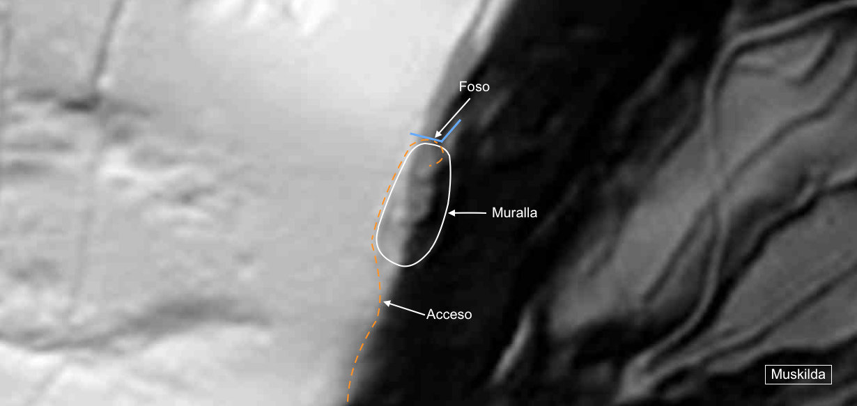 LOCALIZACIÓN Término municipal de Otsagabia Coordenadas ETRS-89, X: 656.253, Y: 4.753.157, Z: 1020 TOPONIMIA Muskilda CONTEXTO PAISAJISTICO Pronunciado cerro al Norte de la localidad, en cuya cumbre se encuentra el santuario de Nuestra Señora de Muskilda, de gran arraigo popular, mantenido por la cofradÃa homónima. Por su cumbre pasa la vieja ruta que desde el paso se Egurgio en Irati, asciende a la sierra de Abodi y desciende por Arrizabala, también llamado Paso de las Alforjas (GR-11). Antaño sus laderas se utilizaban como tierras de labor agrÃcolas, hoy forestadas en su mayor parte. HISTORIOGRAFÃA Inédito como castro DESCRIPCIÓN Recinto fortificado de planta oval, a base de grandes terraplenes que interiormente guardan potentes murallas de piedra. Se encuentra muy alterado desde época antigua, en él se construyo una ermita bajo la advocación de nuestra Señora de Muskilda, que nos hace sospechar del carácter de santuario ya en la Edad del Hierro y época romana. TIPOLOGÃA Núcleo de población Superficie fortificada: 7.500 m2 PerÃmetro fortificado: 355 m Eje máximo: 135 m Eje mÃnimo: 55 m CronologÃa: Hierro Emplazamiento: Loma USO DEL SUELO PolÃgono: 2; Parcela rústica: 308; Subparcelas: A,B,C Grupo: Frondosas, Cobertura principal: Hayas (Fagus sylvatica); Recinto 12440 INTERPRETACIÓN Y VALORACIÓN La existencia desde la antigüedad de la ermita, nos hace especular si ya en la Edad del Hierro tendrÃa el carácter de santuario. El gran arraigo y tradición, no solo en Otsagabia sino, en todo Salazar nos hace pensar que fuera asà antes del cristianismo. De cualquier forma, su localización en este lugar, denota un interés en controlar la antigua ruta pecuaria entre los altos pastos de Abodi y el valle del Salazar y a la vez servir de refugio en caso de necesidad a los asentados junto al rÃo. MATERIALES No se han recogido. CONSERVACIÓN A pesar de la acusada antropización del lugar, creemos que puede haberse conservado estratigrafÃa, aunque no en la parte alta ocupada por el edificio religioso, pues este complejo habrá borrado todo resto del antiguo poblado. Aparte de los terraplenes laterales donde apreciamos restos de murallas, poco podemos decir del acceso pues la vegetación impide la visión y nada hemos podido identificar con un mÃnimo de seguridad, aunque bien pudo hacerse por la loma Sur, acceso tradicional del santuario desde el pueblo haciéndolo circular bajo la muralla occidental y el foso Norte. A hacerse la carretera actual por el Norte se relleno el posible foso que dificultaba el acceso desde esta zona donde se pueden ver restos de fuertes muros, posiblemente pertenecientes a la escarpa del mismo. CIRCUNSTANCIAS DEL HALLAZGO Prospección de Zuriñe Iturri Lizoain y Juan Mari MartÃnez Txoperena, en el contexto del poblamiento protohistórico pirenaico a la llegada de los romanos el 8 de abril del 2017. BIBLIOGRAFÃA | ||